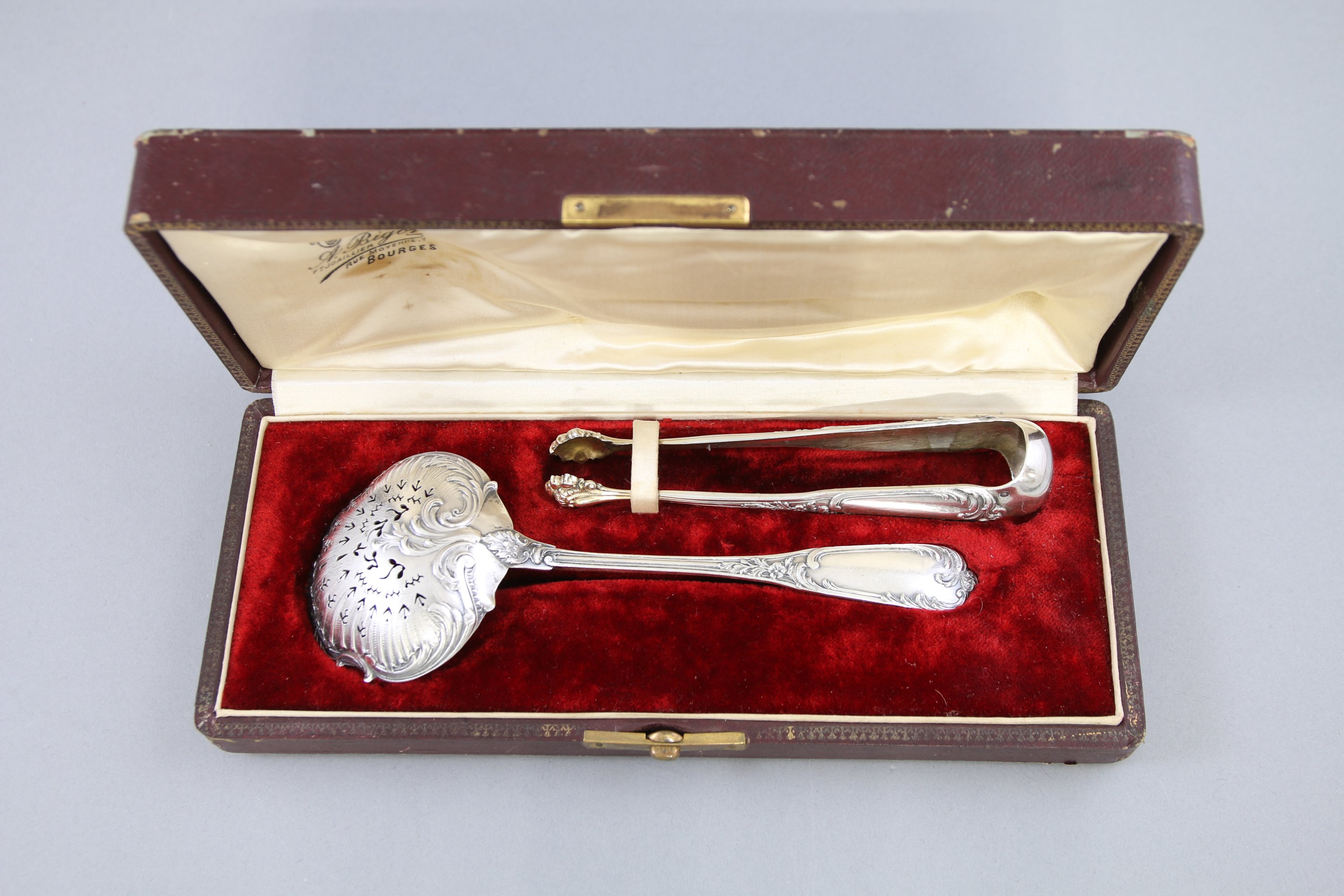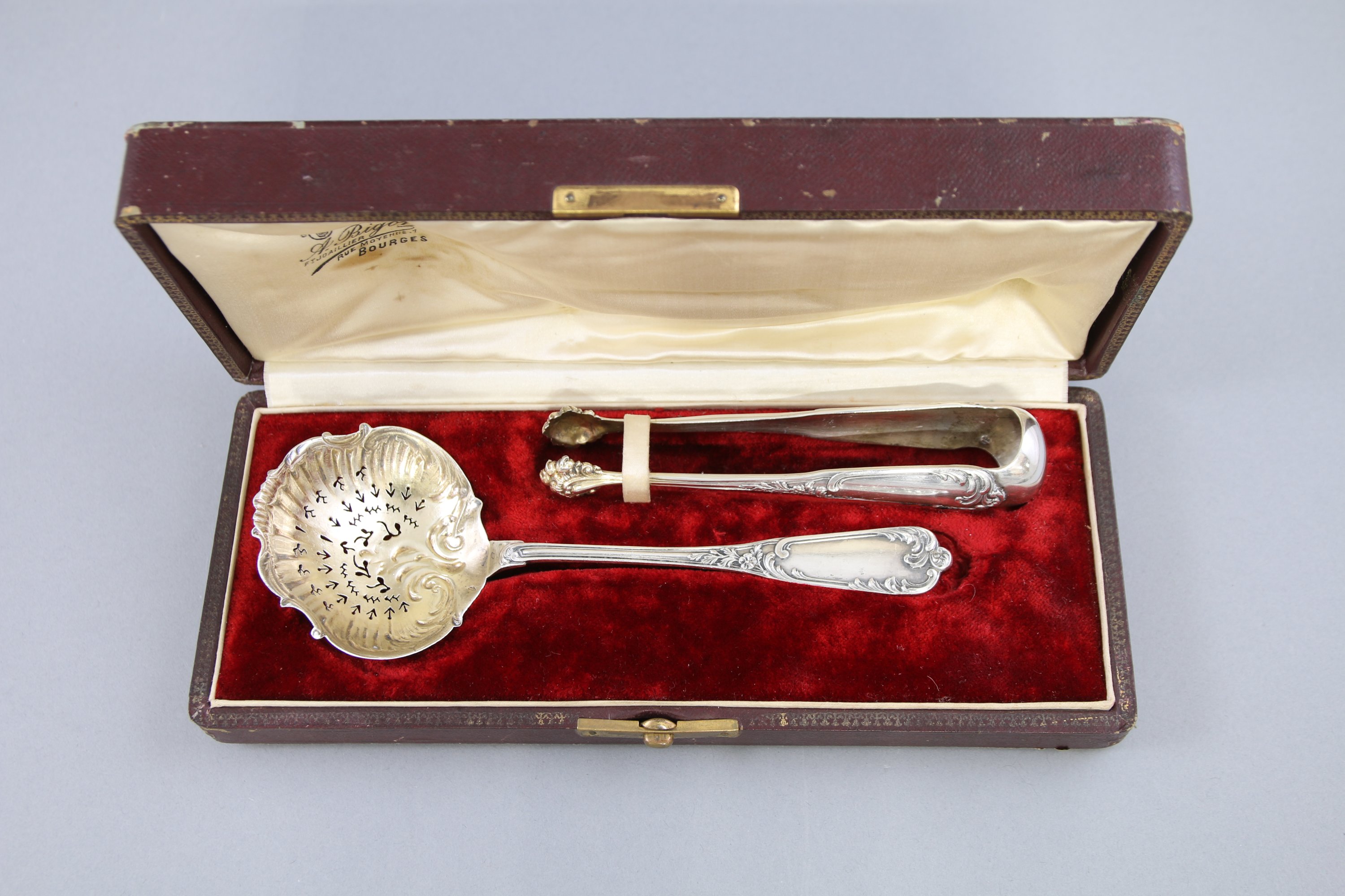 Modèle rocaille comprenant une cuillère à saupoudrer et une pince à sucre.