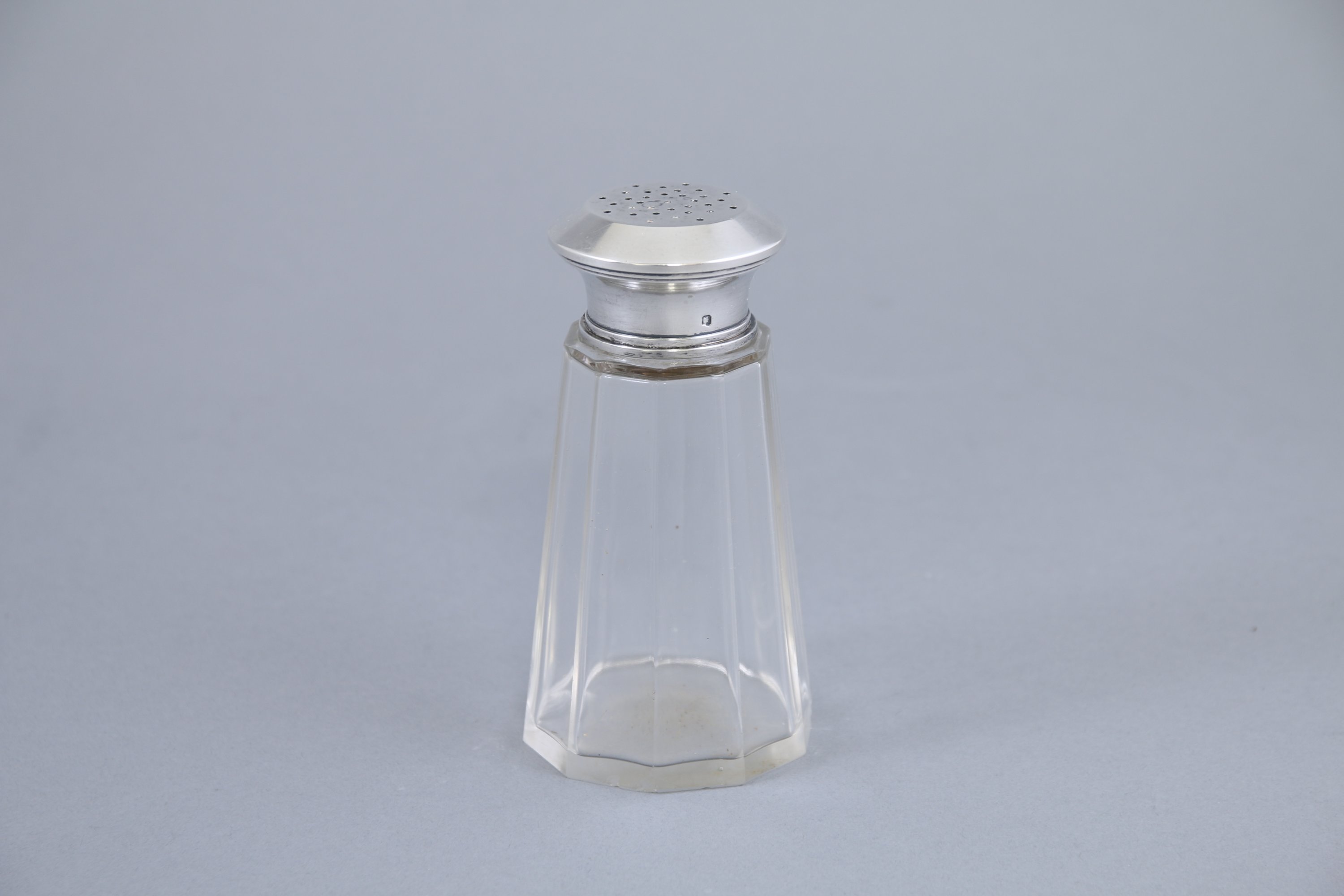 Joint: une salière à monture en argent et flacon en verre à pans coupés (accident au revers). Poids de la monture 40 g