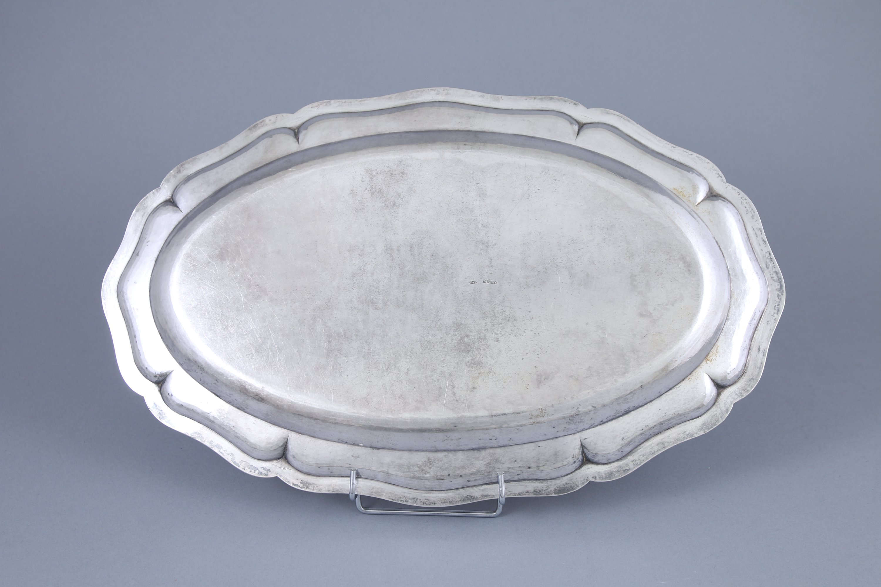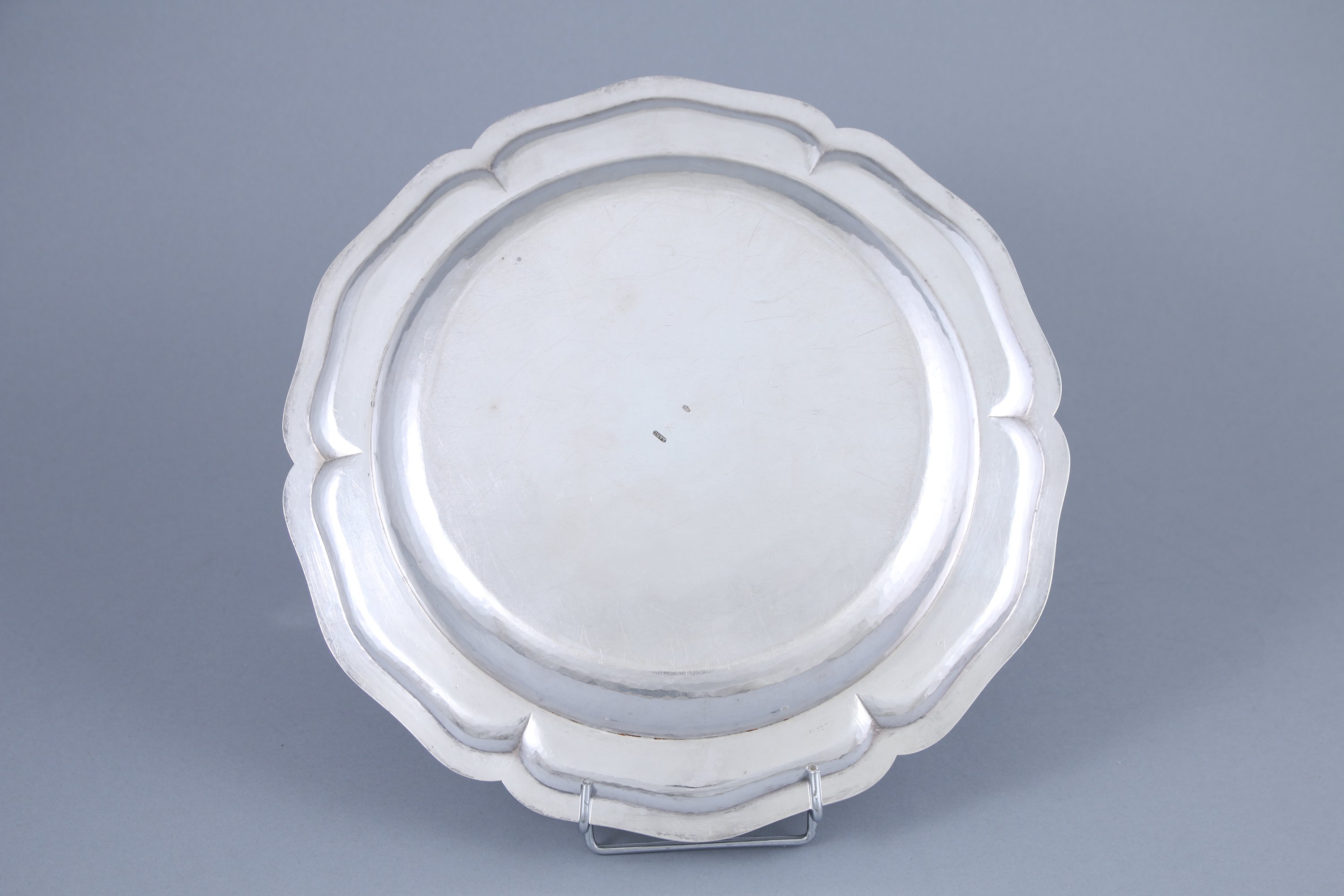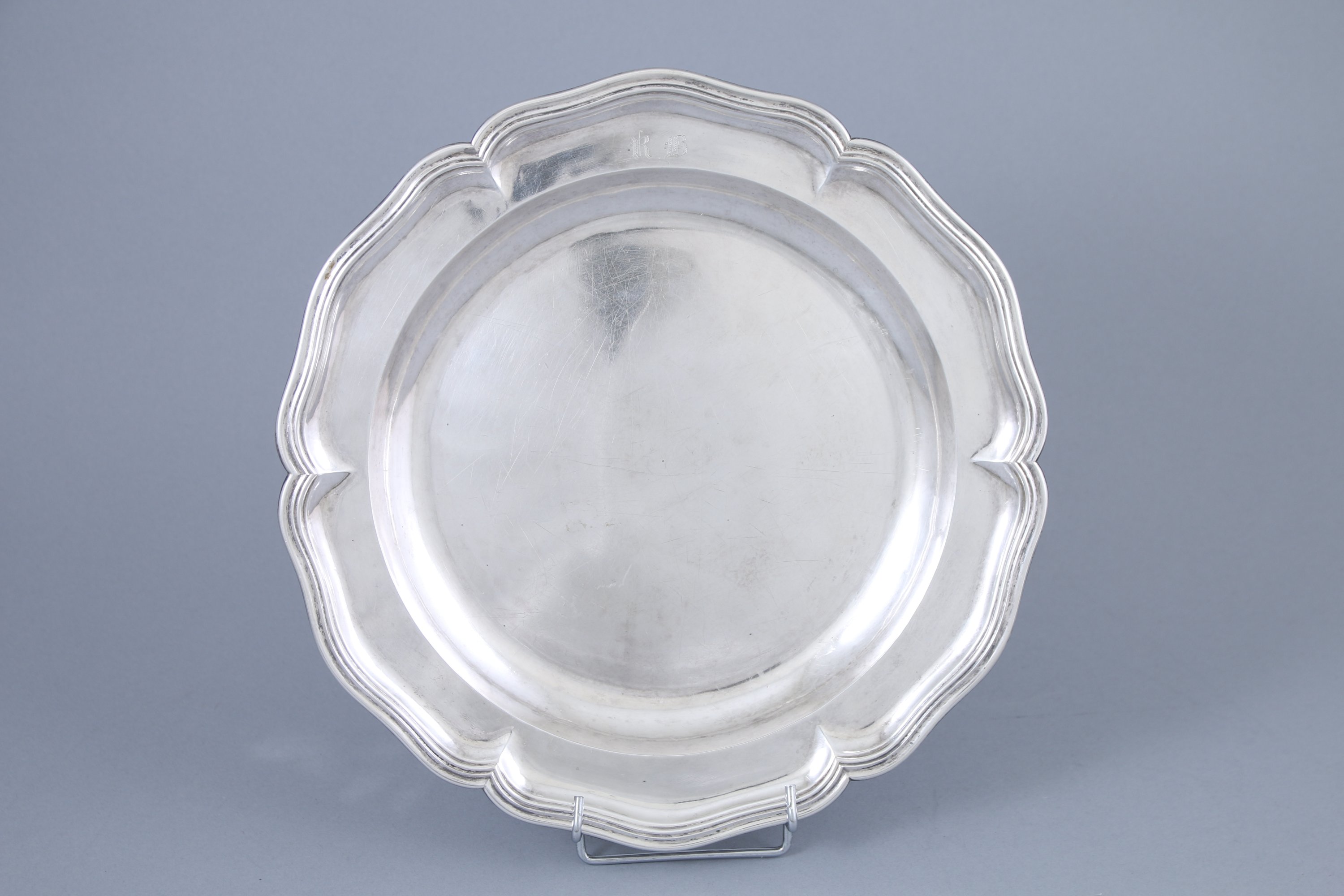 Joint: Plat circulaire en argent, modèle à batte contour, monogrammé "RB". Poinçon "RL2". Orfèvre: "Mamu". Diam. 32,5 cm. Poids: 974 g.