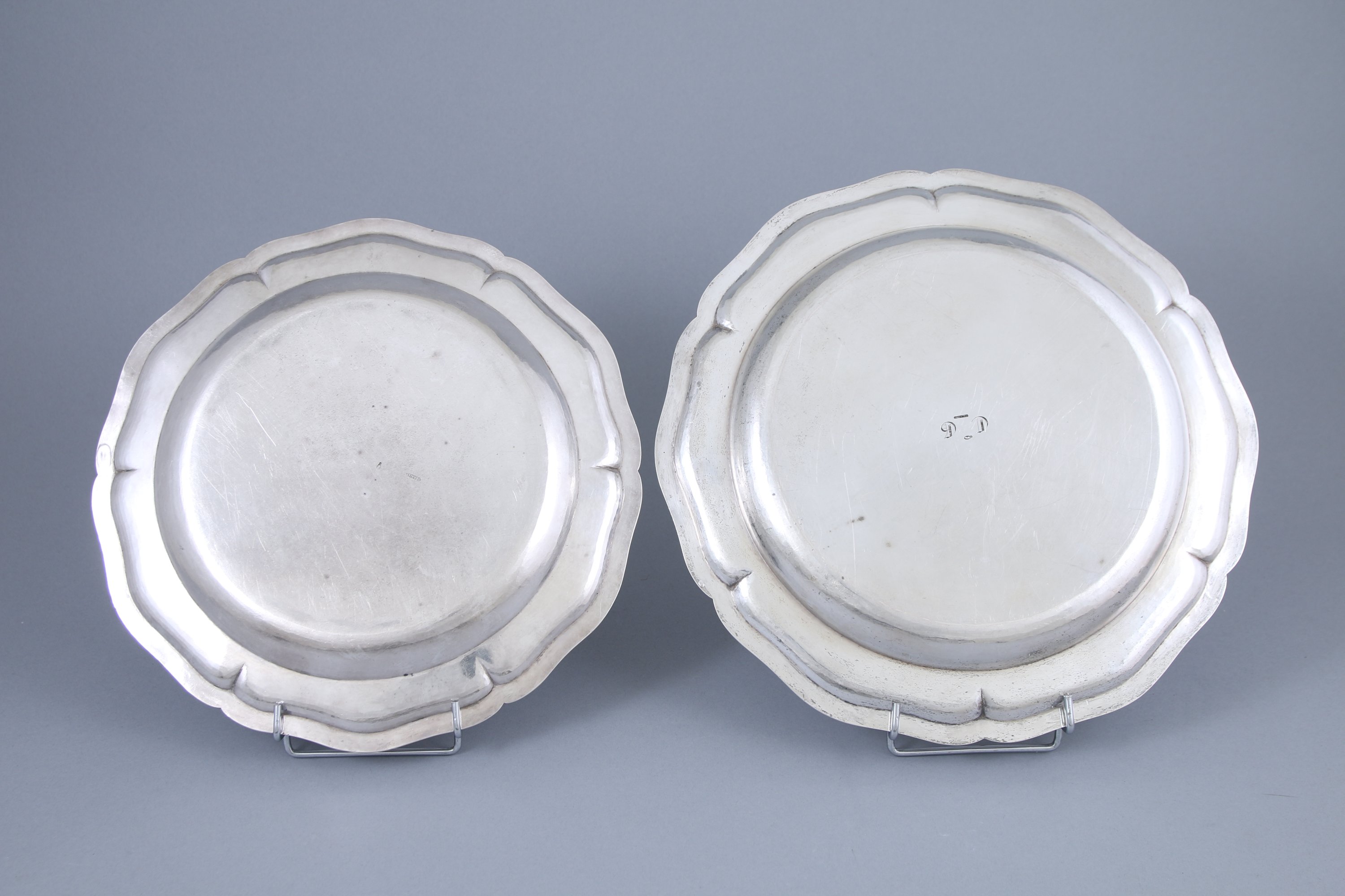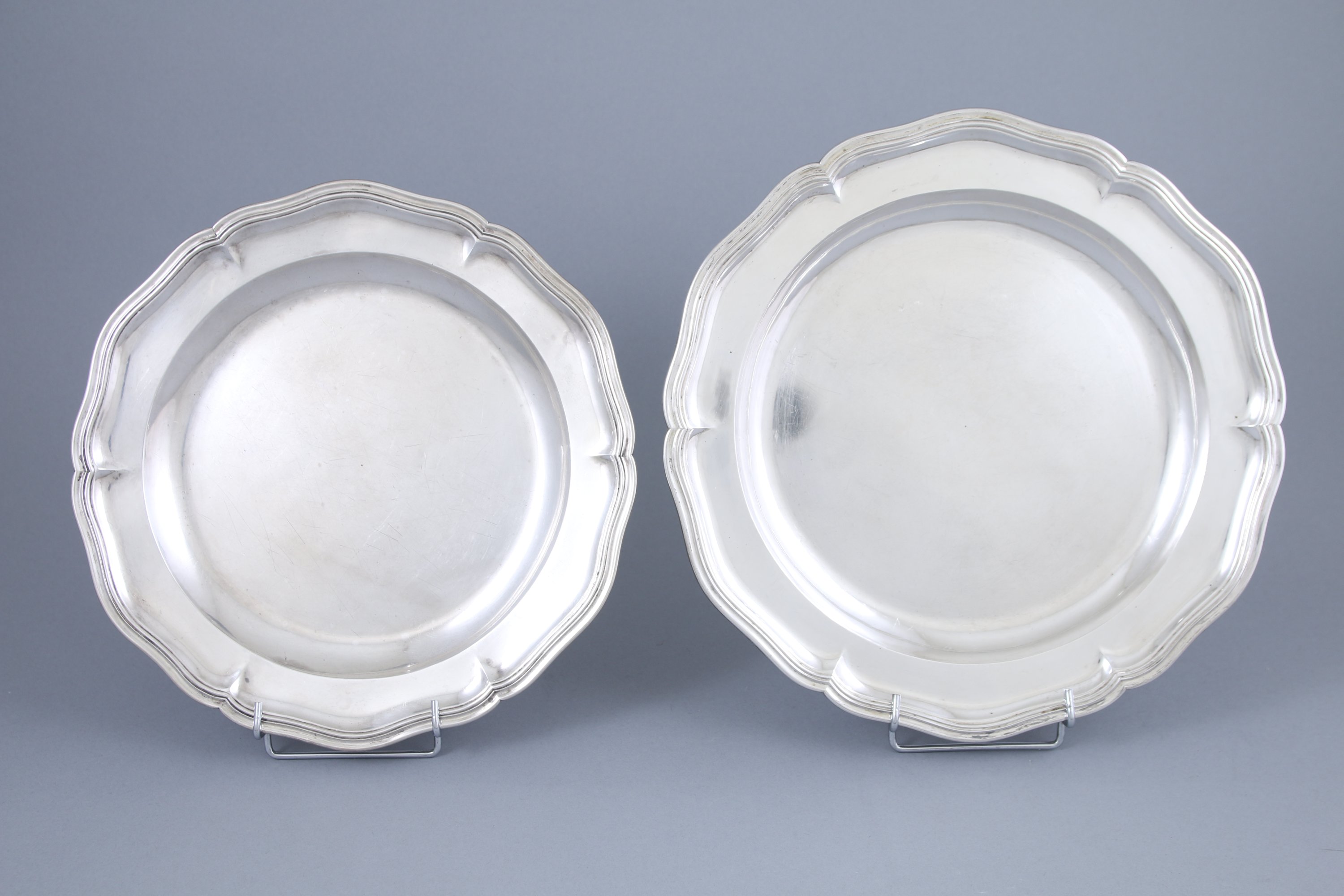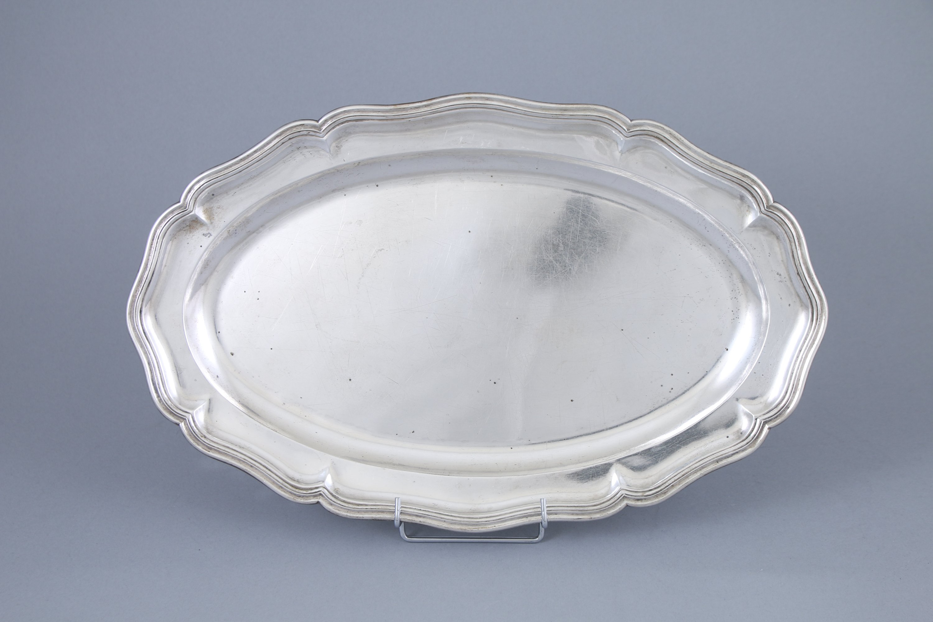 Joint: Plat circulaire en argent, modèle à batte contour, monogrammé "RB". Poinçon "RL2". Orfèvre: "Mamu". Diam. 32,5 cm. Poids: 974 g.