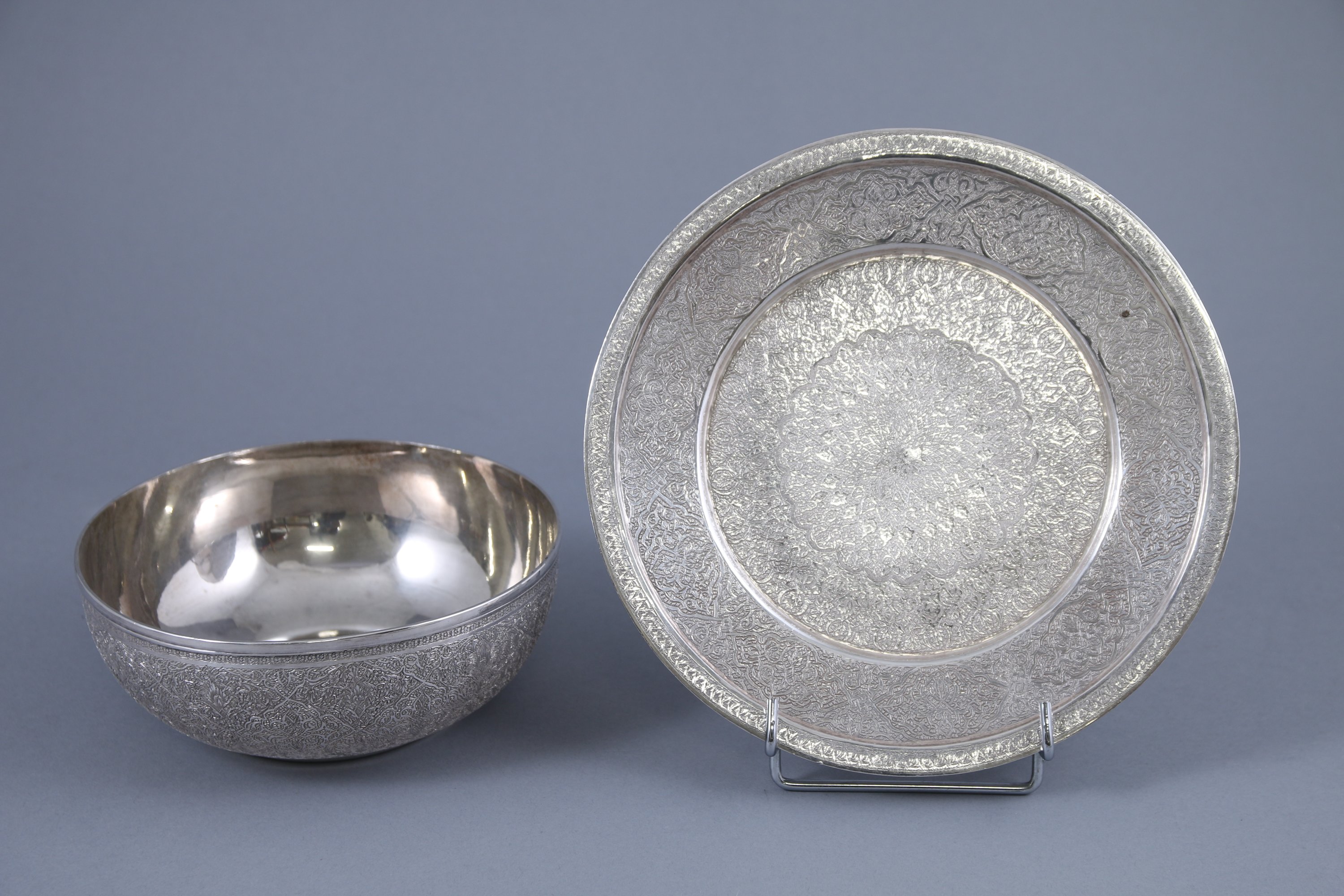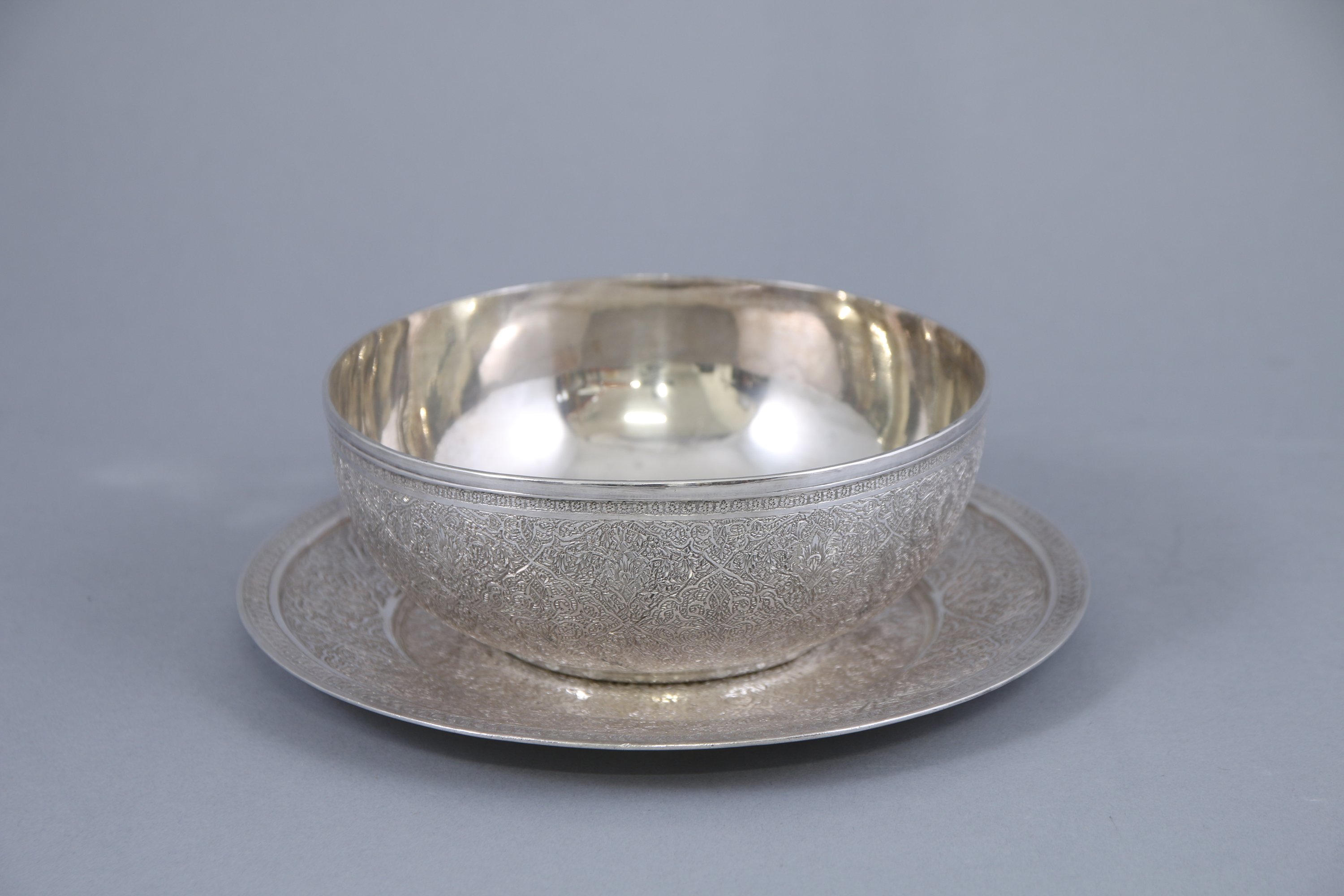 La coupe à la lèvre moulurée surmontant une panse à riche décor gravé de cartouches entrecroisés d'enroulements et motifs végétaux. Le dormant présente en son centre un motif floral polylobé.