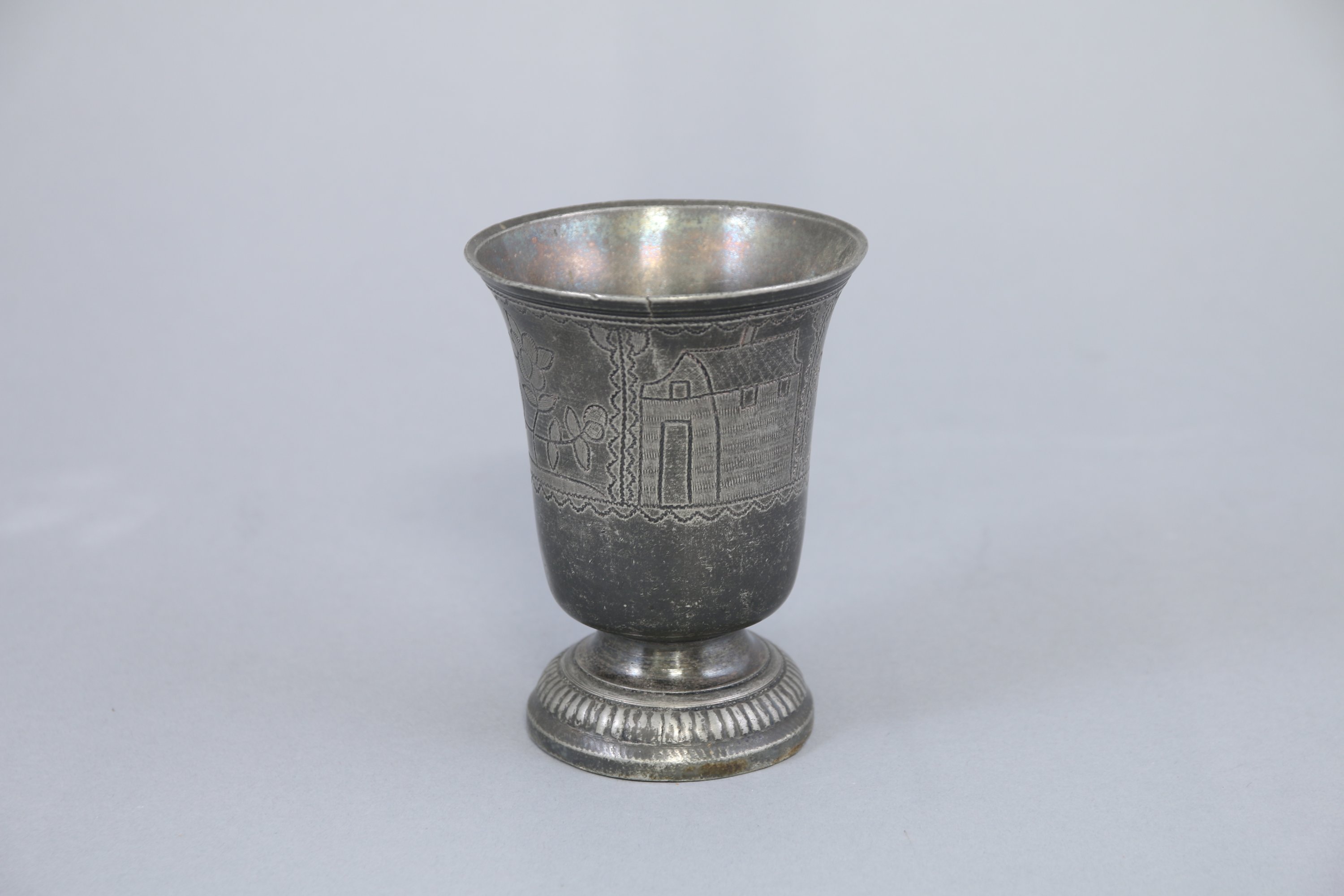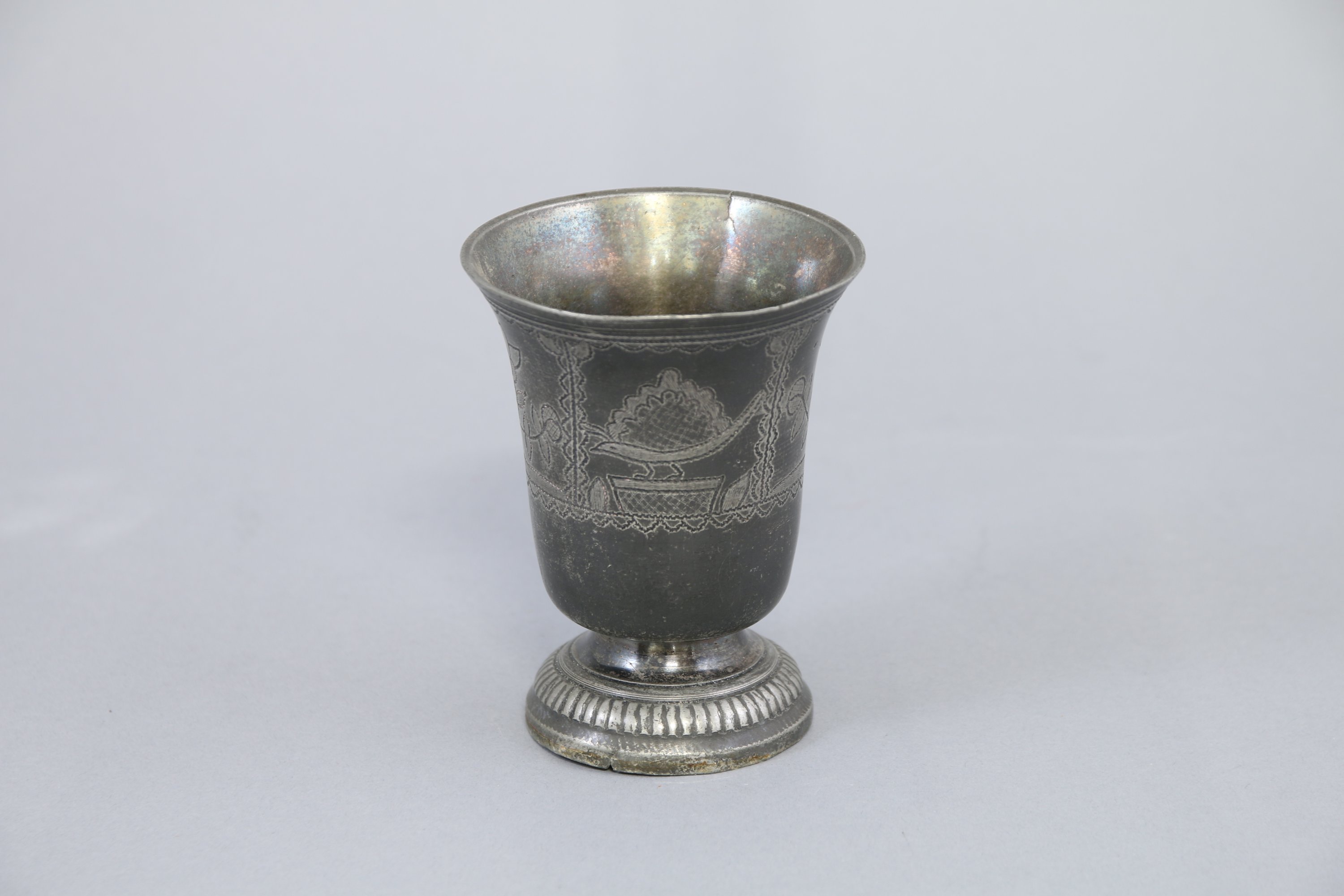 La lèvre évasée et la panse à décor d'une maison, fleurs et oiseau dans des cartouches. Le pied circulaire à godrons.