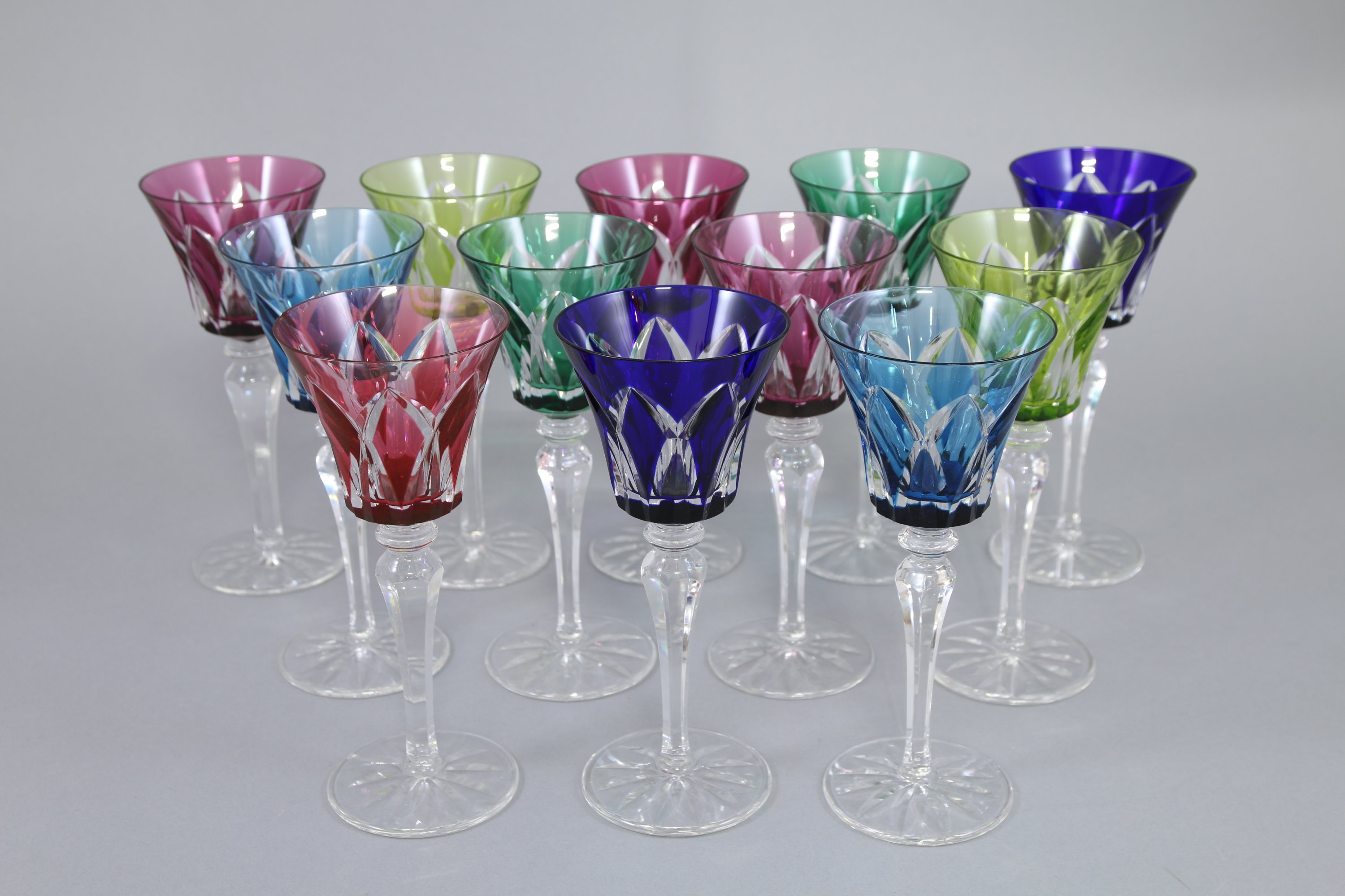 Composé de 12 verres à vin du Rhin - couleur chartreuse (2), bleu foncé (2), rouge (1), rose (3), bleu clair (2) et vert (2) - quatre verres à eau, neuf verres à vin rouge, 11 verres à vin blanc, 12 verres à liqueur - couleur rose (2), rouge (2), vert (2), bleu foncé (2), bleu clair (2) et chartreuse (2) - et une carafe.