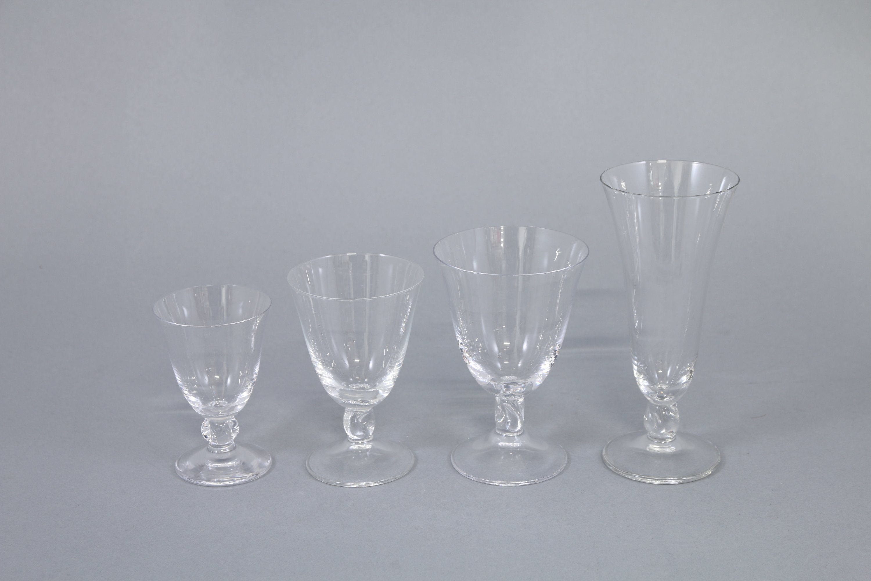 Flûtes: Haut. 16 cm. Verres à eau: Haut. 12,5 cm. Verres à vin: Haut. 11 cm. Verres à Porto: Haut. 9,5 cm. (égrenures sur un verre à Porto)