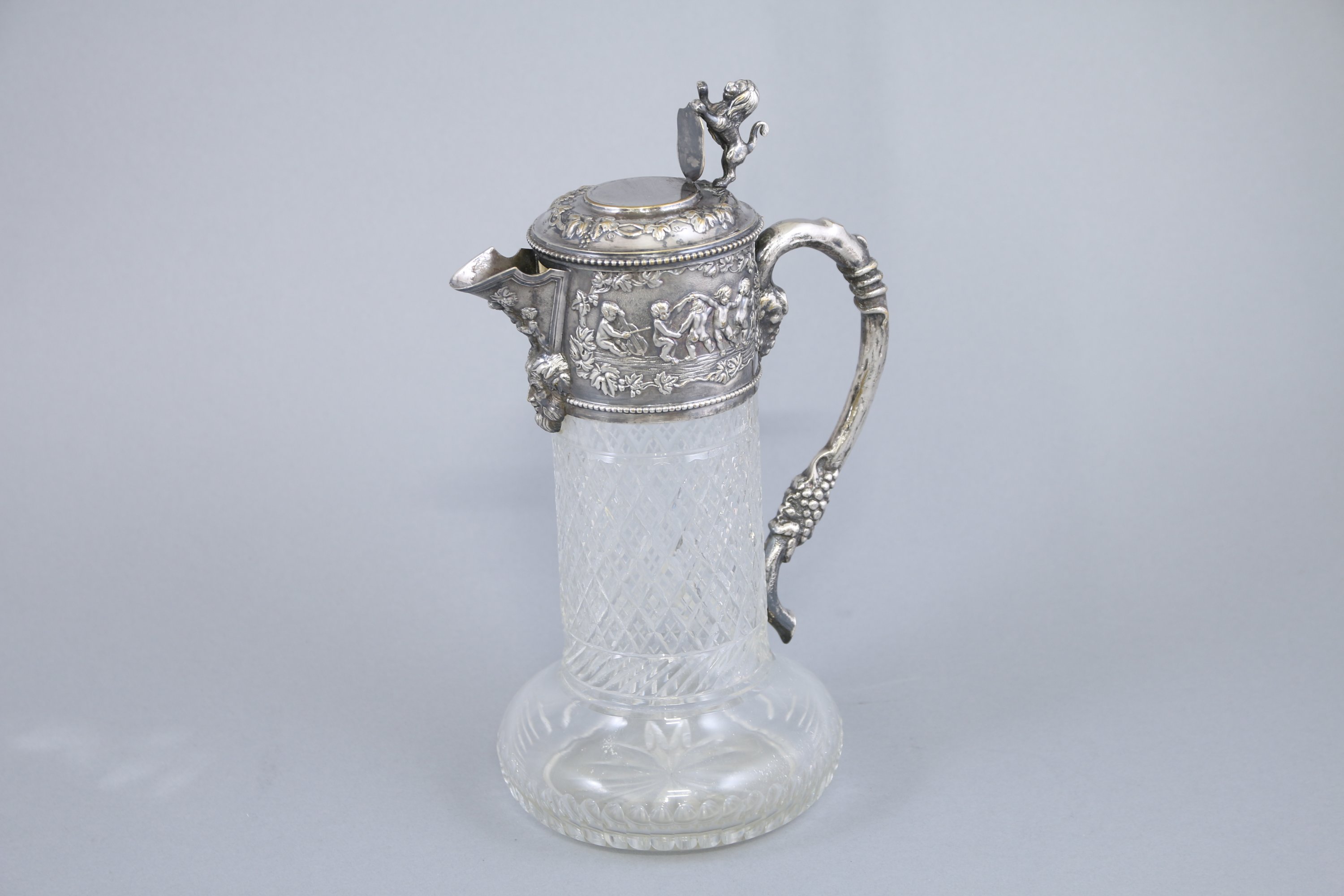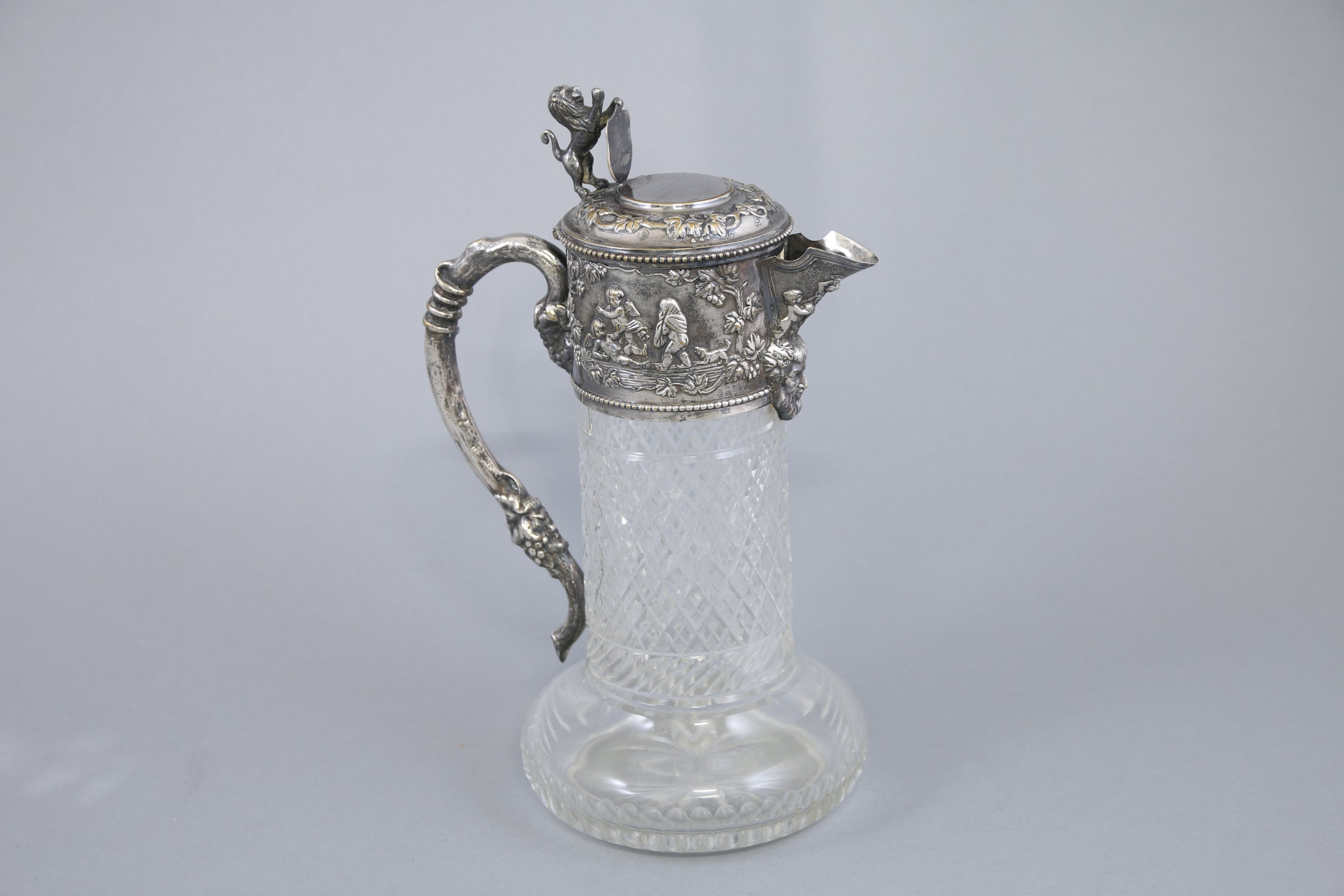 L'appui pouce en forme d'un lion au blason inscrit sur une terrasse à décor de frise de pampre. Le col cerclé est orné de deux cartouches aux amours et enfants dansant. La panse est décorée de losange. Une anse terminée par une grappe de raisin.