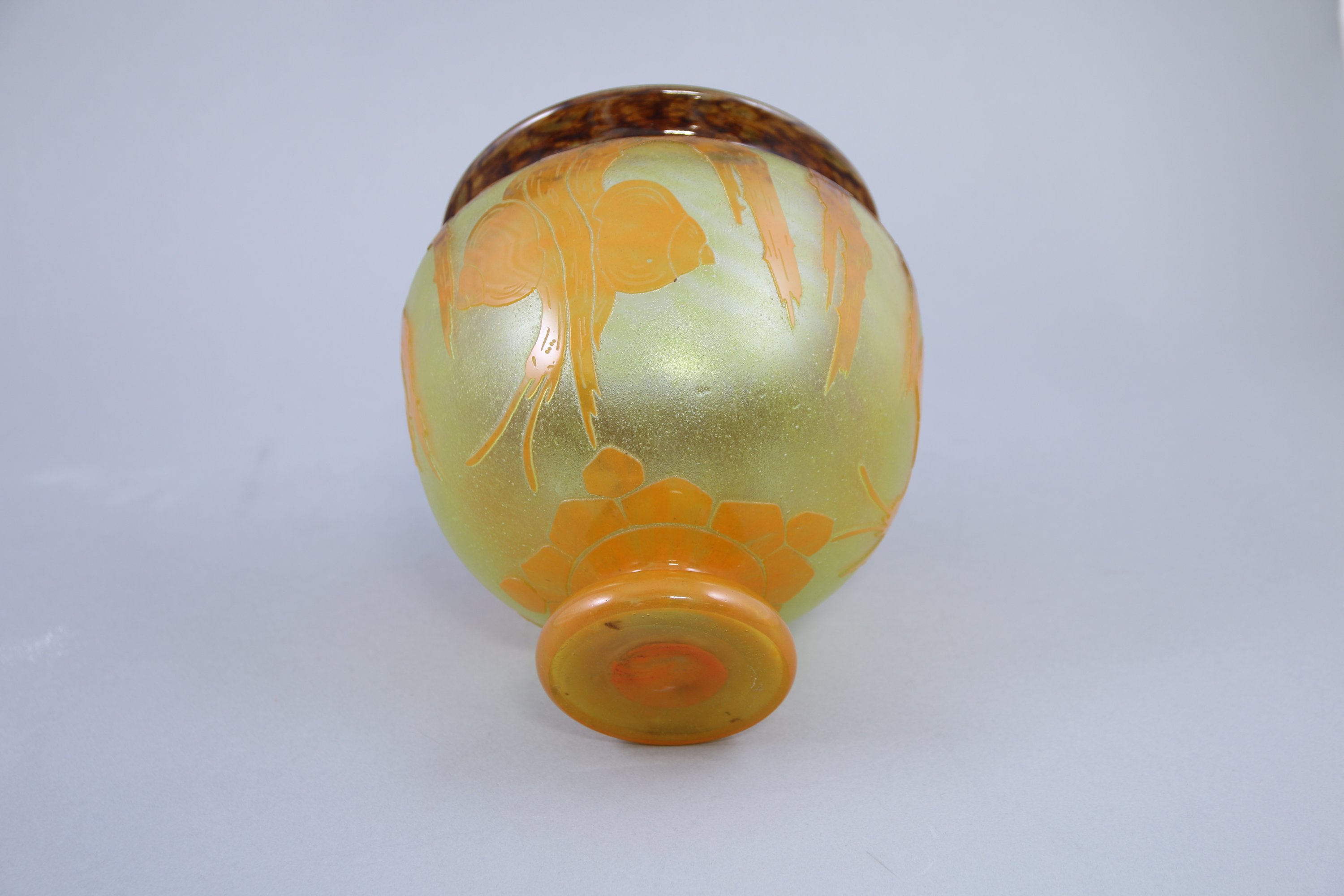 La panse renflée est décorée d'escargots et de branchages orangés sur un fond marmoréen jaune.