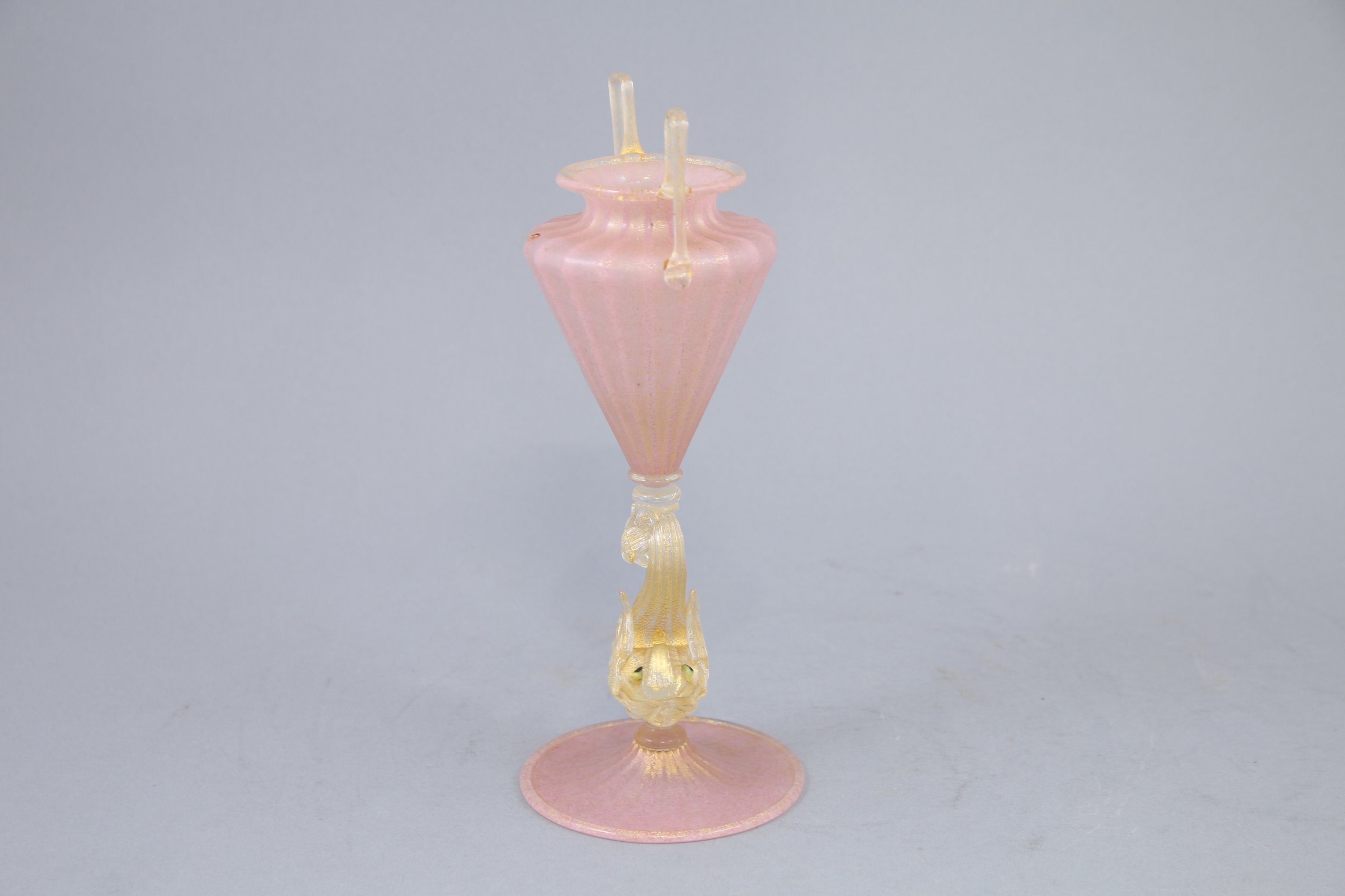Le col entouré de deux anses à la grecque surmontant une panse cannelée. Le pied en forme de dauphin.