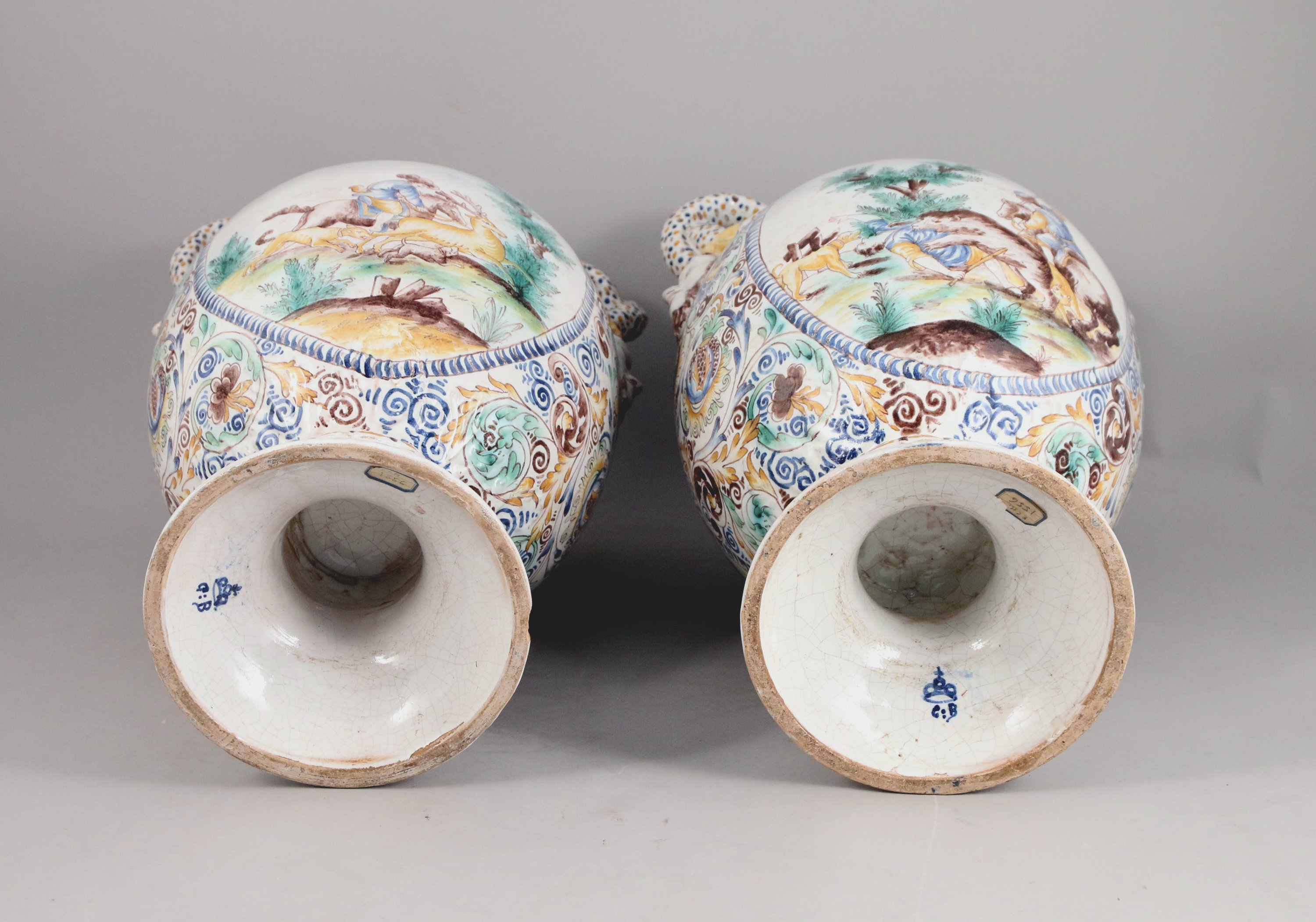 Faïence polychrome à décor de motifs floraux, à deux anses torsadées se terminant par des têtes de satyres. La panse offre un blason surmontant, sur une face, une scène de chasse à courre, sur l'autre une chasse à l'ours.