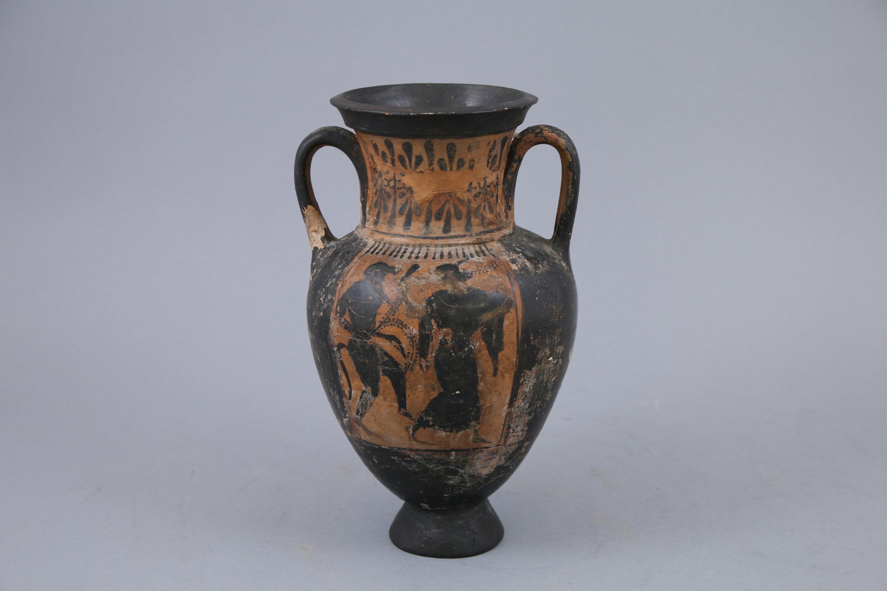Décor de palmettes sur le col et de scènes dionysiaques sur la panse: A/ Dionysos assis tenant une coupe. B/ Satyre poursuivant une ménade.