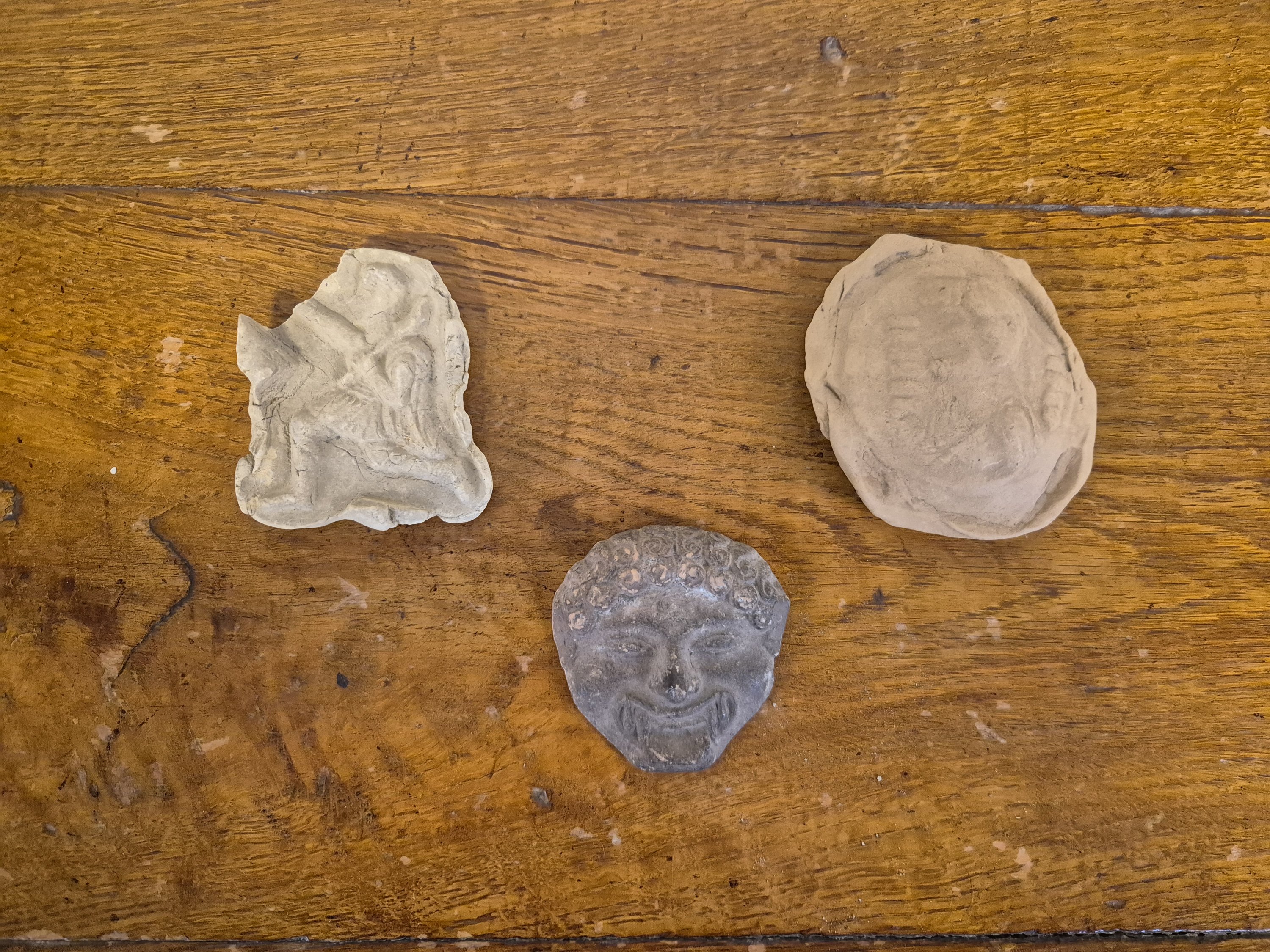 Joint: trois moulages de reliefs antiques (Gorgone, chasseur et visage de profil). Long. 5,5 à 7,5 cm.