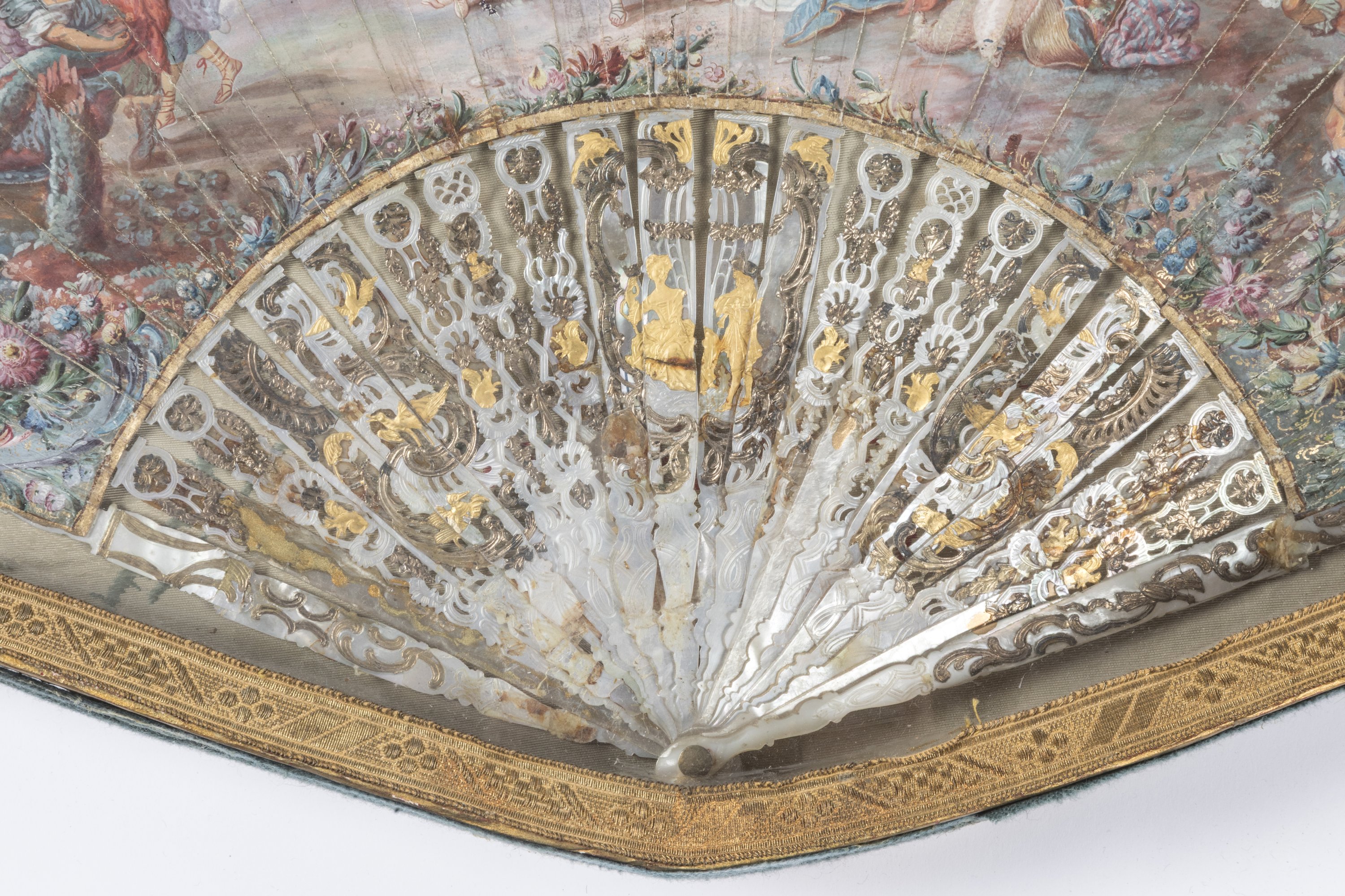 A painted paper and mother-of-pearl fan depicting the meeting between King Solomon and the Queen of Sheba. Paris or Versailles, ca. 1740.