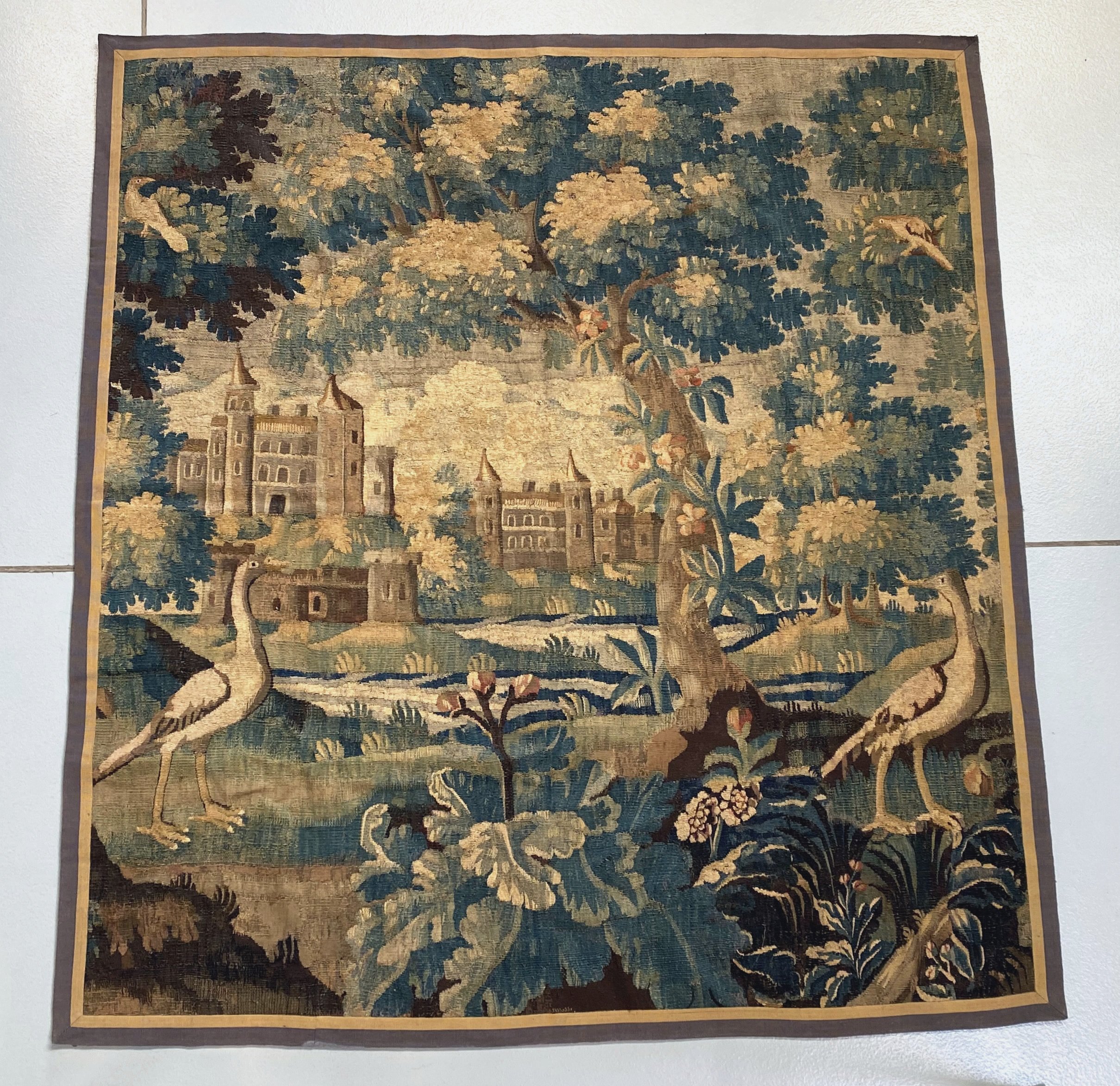 Verdure à la rivière, château et oiseaux.