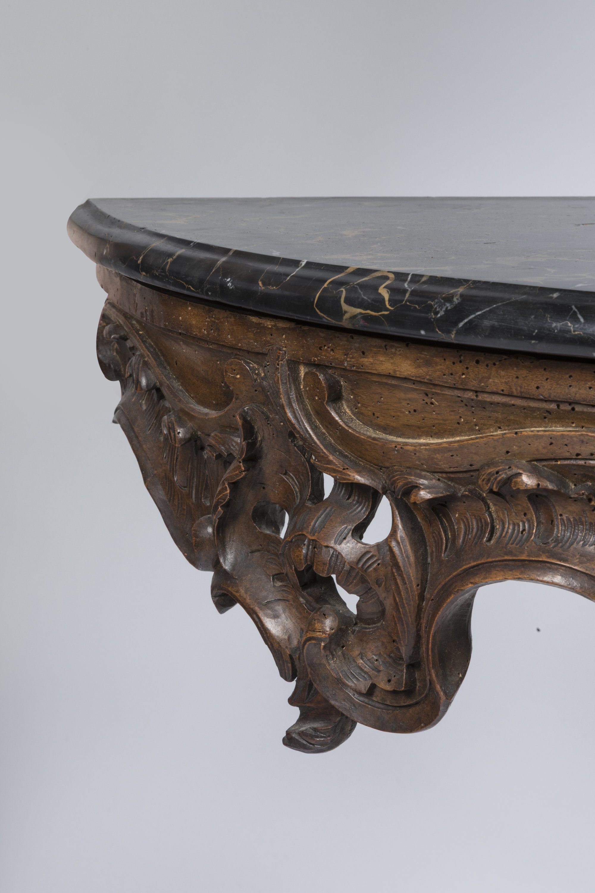 De forme demi-lune, elle présente une ceinture richement décorée d'un fruit et torsadée sur fond de coquille et rinceaux végétaux. Elle repose sur un pied cambré terminé par une feuille d'acanthe.