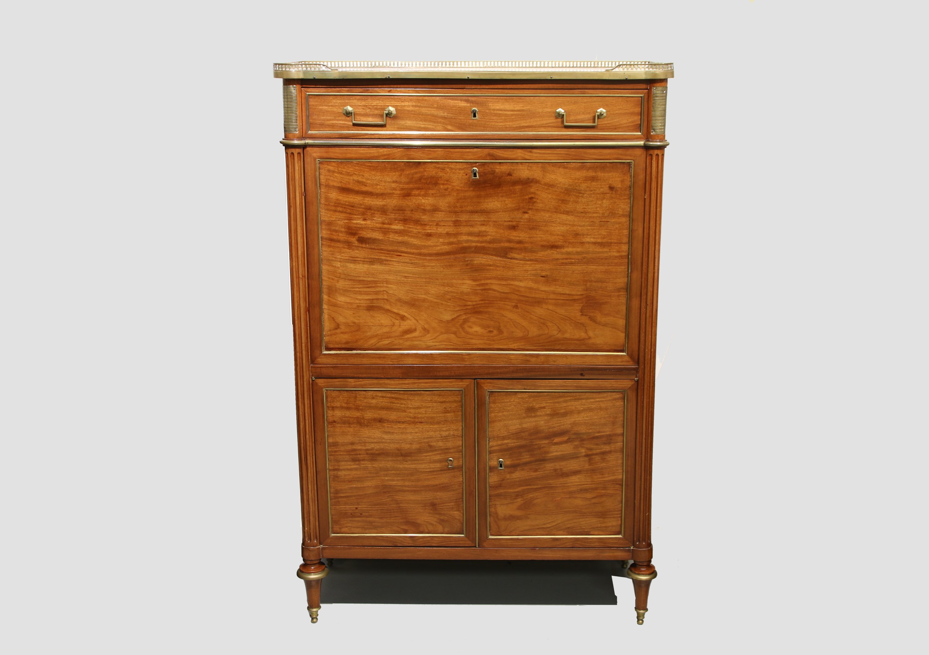 La partie supérieure ceint d'une lingotière et ouvrant par un tiroir surmontant un abattant découvrant sept tiroirs et trois niches. La partie inférieure à deux vantaux. Ornementation en laiton dont grattoirs, filets.