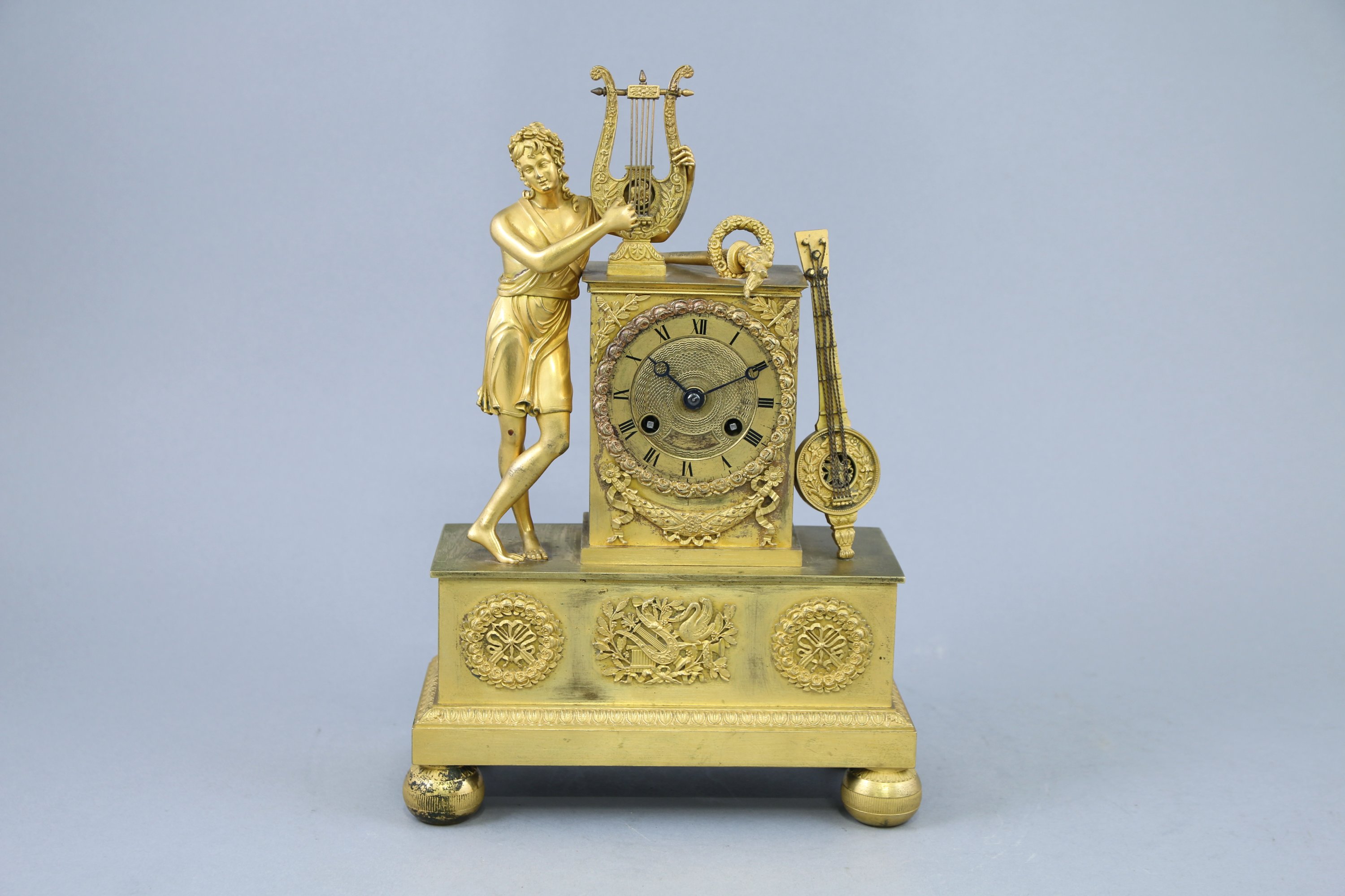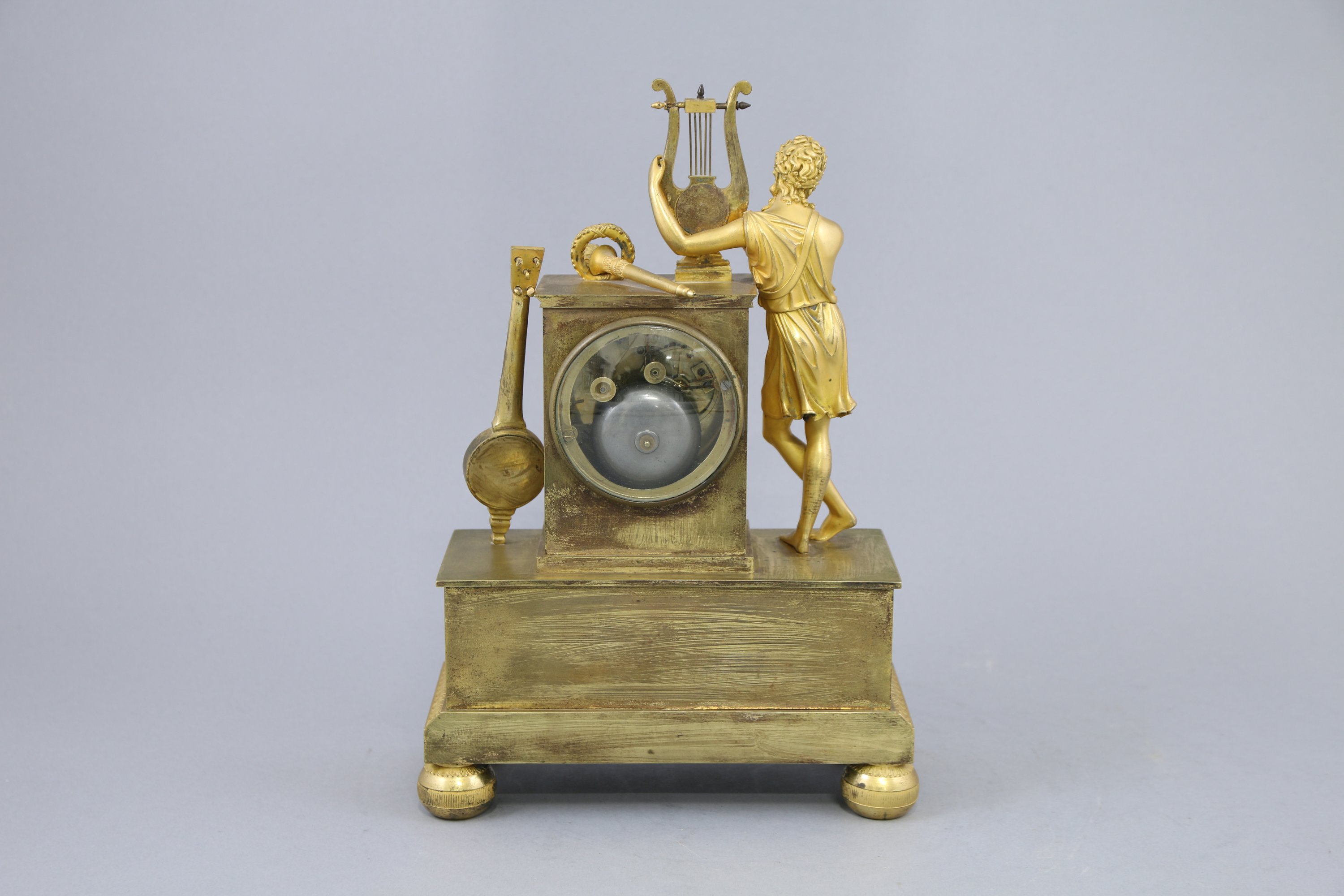 Le cadran à décor guilloché indiquant les heures en chiffres romains est inscrit dans une borne à laquelle s'accoude Apollon jouant de la harpe. La base rectangulaire à décor d'appliques aux couronnes de laurier et lyre. Quatre pieds patins.