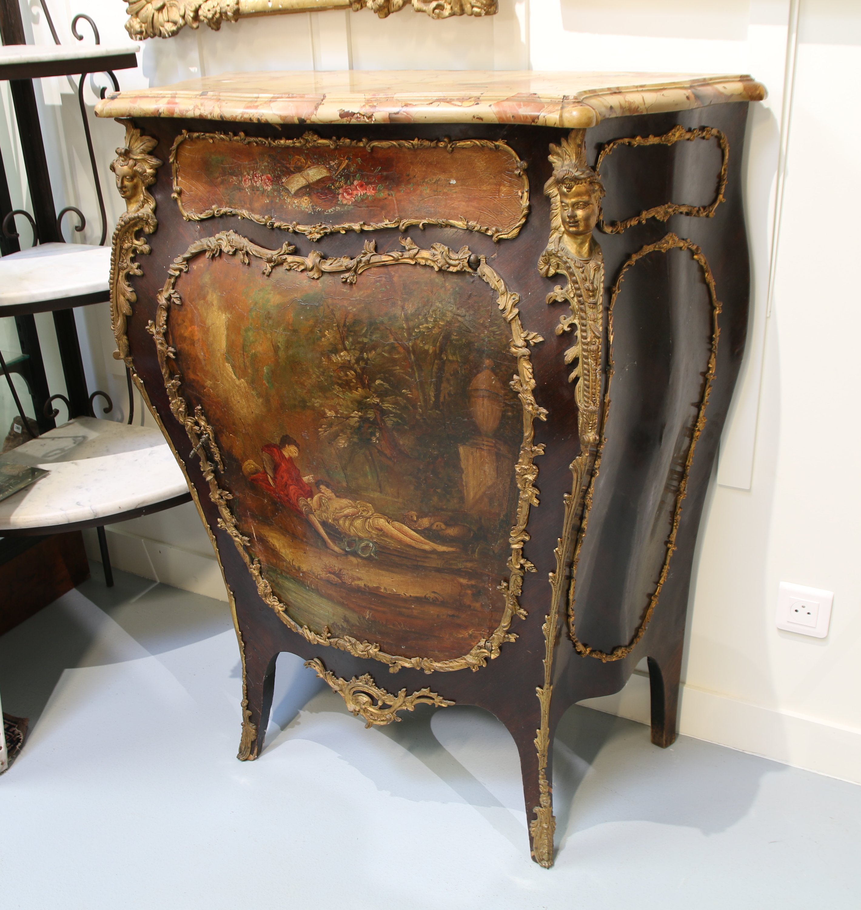 De forme bombée, il présente en façade un cartouche d'instruments de musique surmontant un vantail au décor d'une scène au couple près de l'eau.