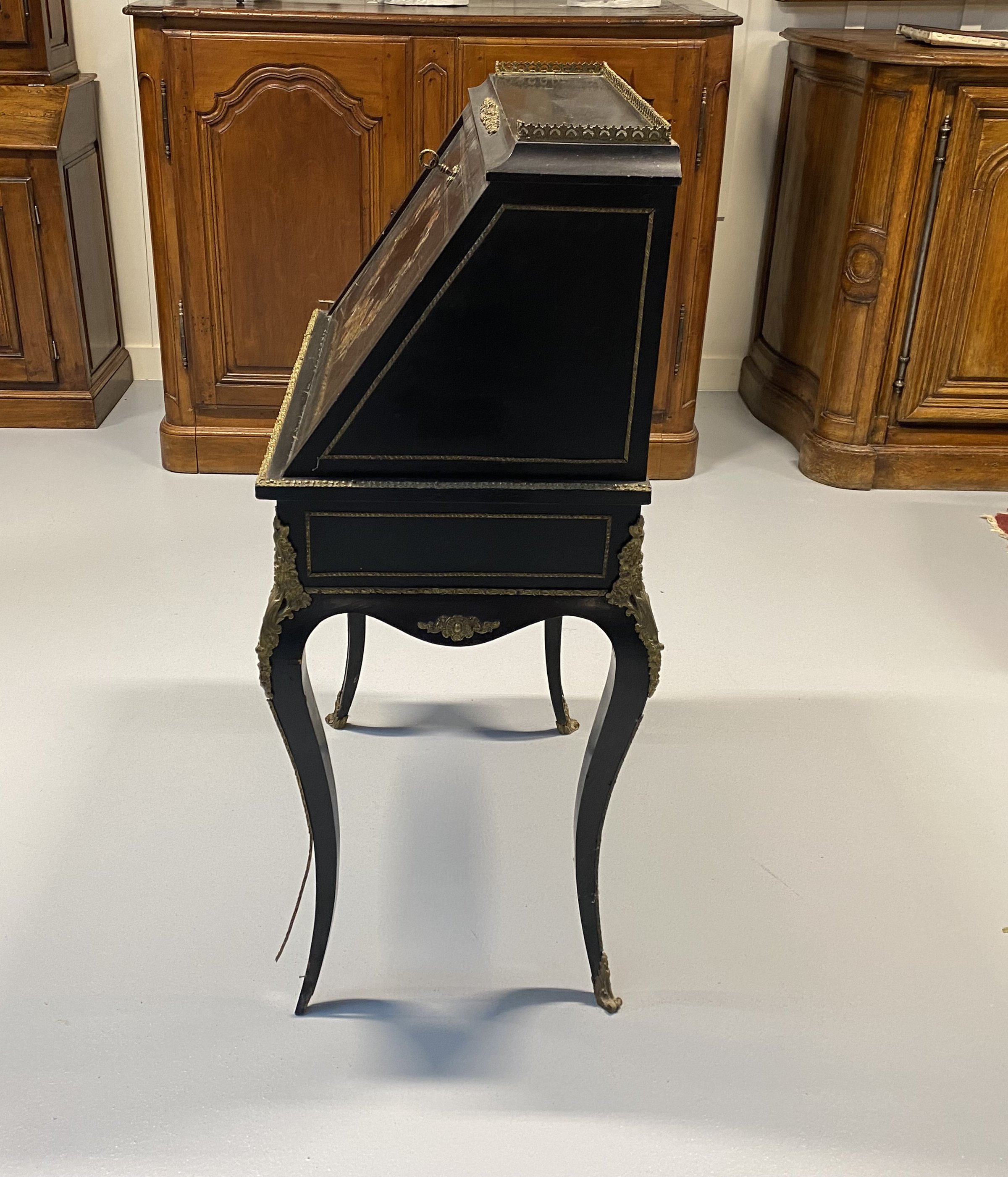 Il ouvre par un abattant à décor laqué d'une couronne florale découvrant deux tiroirs et une étagère. La ceinture ouvre par un tiroir en ceinture. Quatre pieds cambrés.