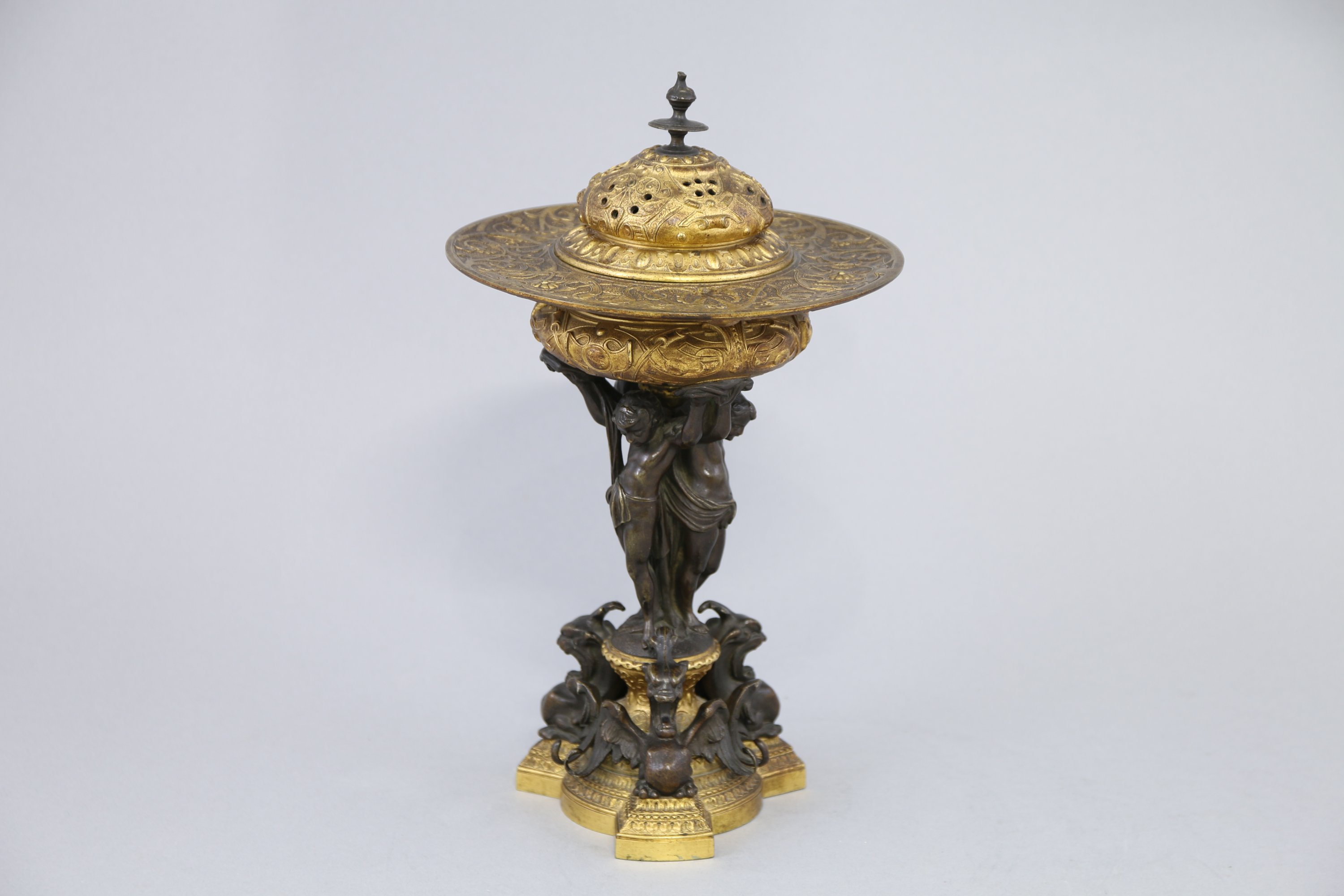 Le couvercle ajouré est sommé d'un fretel en forme de toupie et repose sur une coupe à décor d'enroulements. Le fut est formé par trois enfants reposant sur une base triangulaire ornée de motif de dragon.