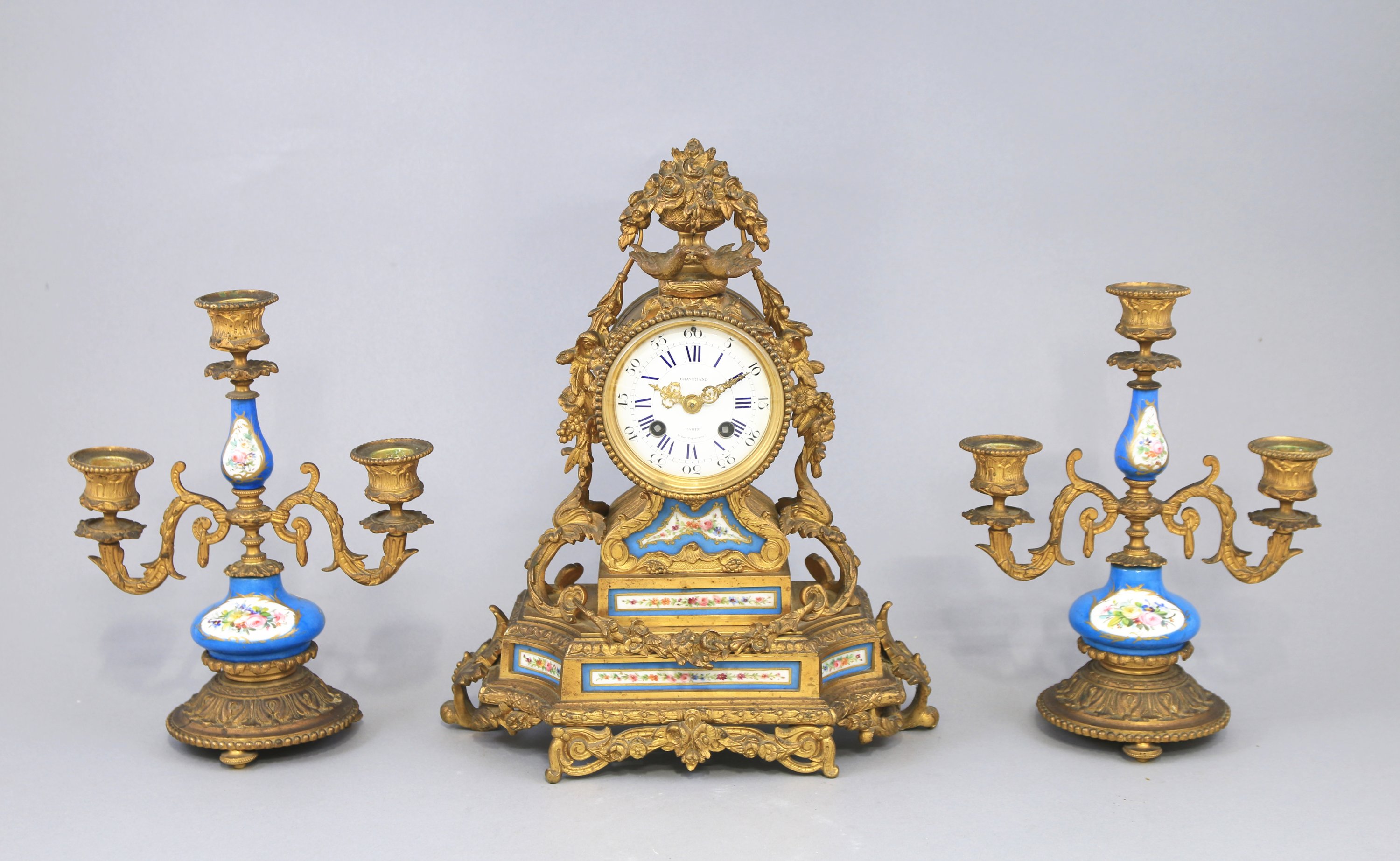 - La pendule à cadran émaillé blanc indiquant les heures par des chiffres romains, les minutes par un chemin de fer et chiffres arabes. Il est signé "Graverand / Paris / Bd des Capucines 1" et surmonté d'un couple d'oiseaux sur son nid sur fond d'un vase fleuri. La base à décor de plaques de porcelaine aux angles rentrés. Elle repose sur cinq pieds. Suspension à Brocot.