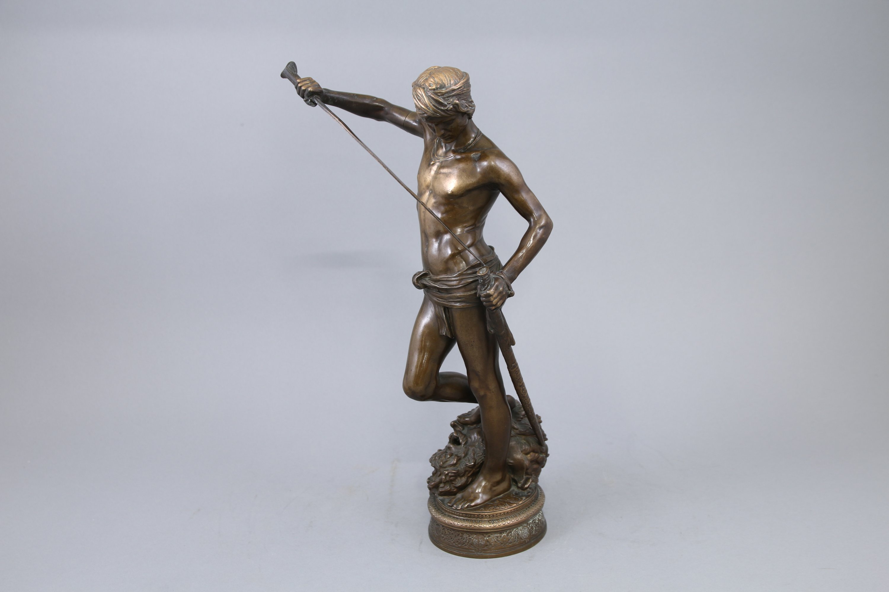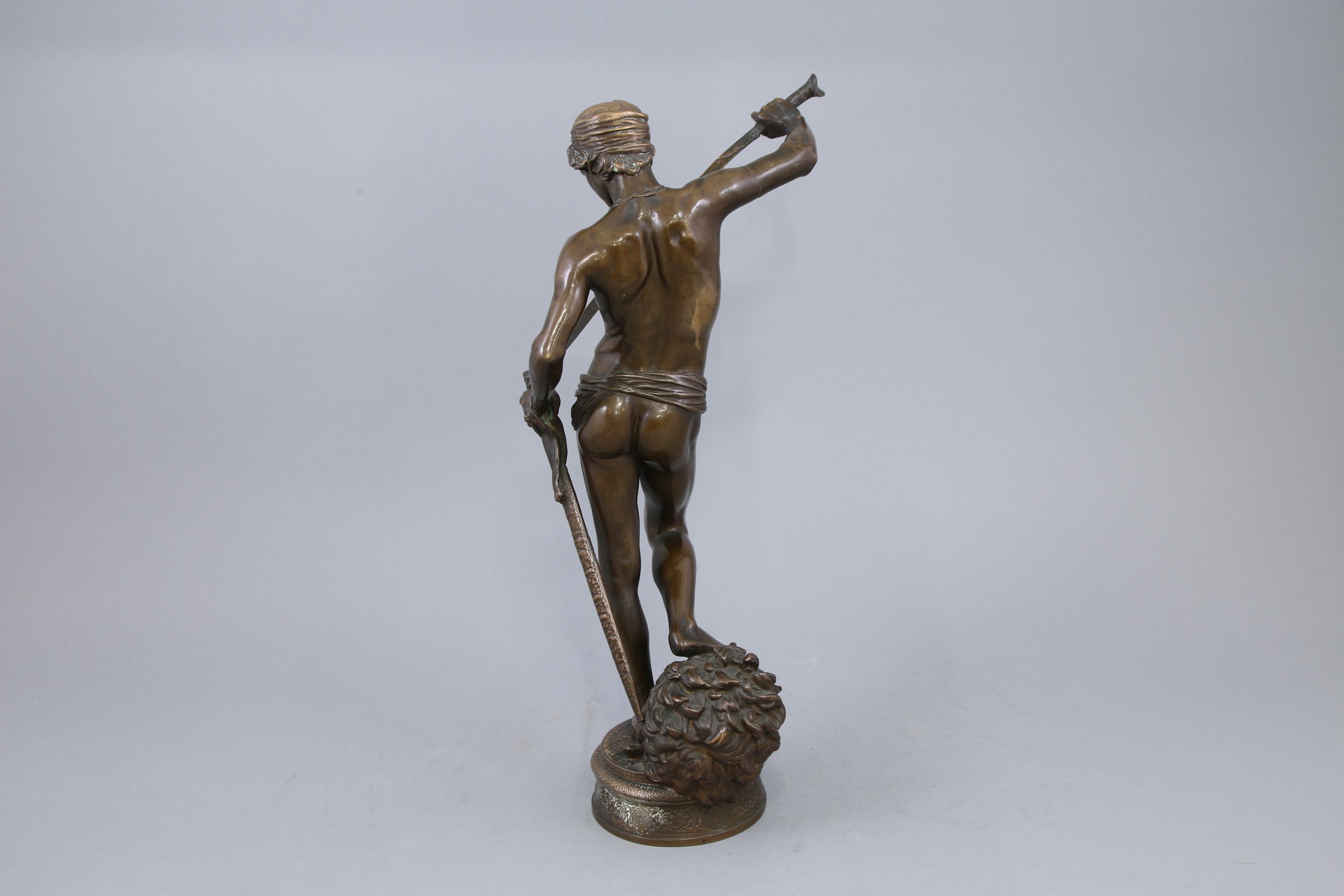 Premier Grand Prix de Rome en 1868, Antonin Mercié envoie depuis la ville éternelle le modèle en plâtre du David vainqueur de Goliath. Il s'inspire à l'évidence de la sculpture de la Renaissance qu'il découvre physiquement, notamment par le traitement du contrapposto. Si le sujet s'inscrit dans le prolongement des Grands Maîtres, à l'instar de Donatello ou Michel-Ange, il fait également écho à l'actualité contemporaine. L'élégance de la pose et la fermeté de son modèle sont perçus comme "symbole d'espoir d'une revanche future de la France sur la Prusse" (musée d'Orsay). Le plâtre original reçoit la médaille de première classe, avant d'être affecté au musée des Augustins de Toulouse (inv. RA 982). L'Etat commande un exemplaire en bronze en 1872, qui est placé au musée du Luxembourg en 1874. Au regard de sa fortune critique, la sculpture est tirée en de nombreux exemplaires en bronze, en six tailles différentes. La nôtre se distingue toutefois du modèle original par le pagne pudique couvrant ses attributs masculins.