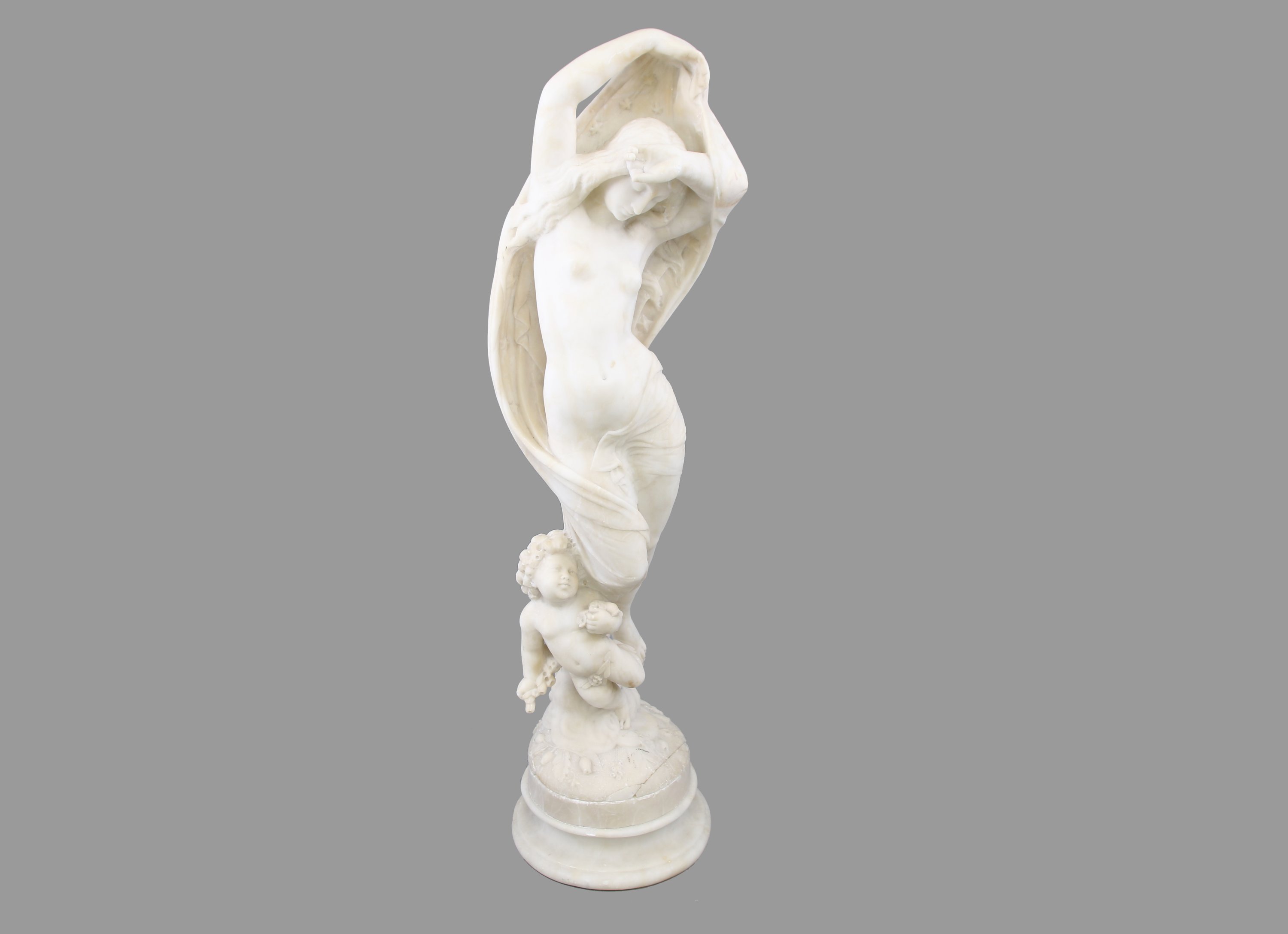 Ramenant au-dessus de sa tête un voile, l’allégorie de la Nuit est le pendant du Jour. Le succès de ces modèles a favorisé une large diffusion au XIXème siècle en marbre, bronze ou encore en porcelaine par la manufacture de Worcester à partir de 1860.