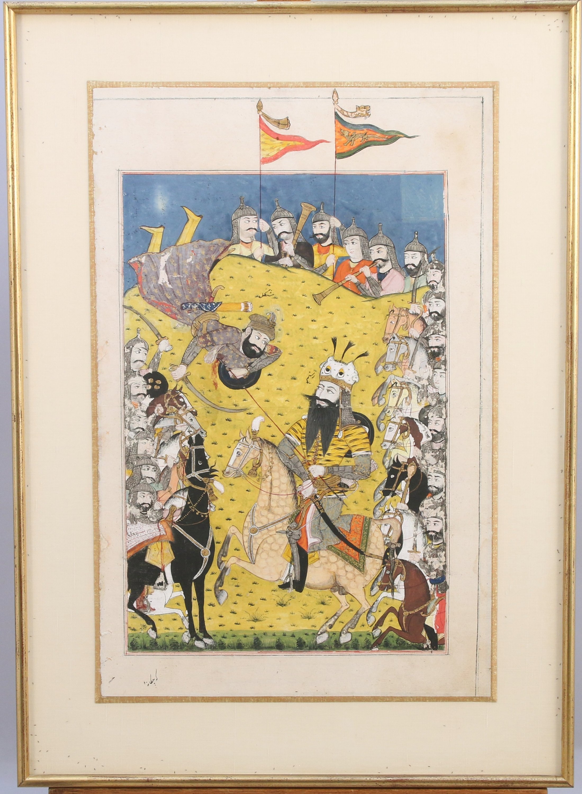- Iran, Qâjâr, XIXe s. Page de manuscrit du Livre des rois illustrant un épisode dans lequel Rostam, représenté avec un casque, transperce la poitrine de Shangal, allié d'Afrasiab. Encadrement doré. Peinture: Haut. 30 Larg. 20 cm. Page: Haut. 38,3 Larg. 24,5 cm.