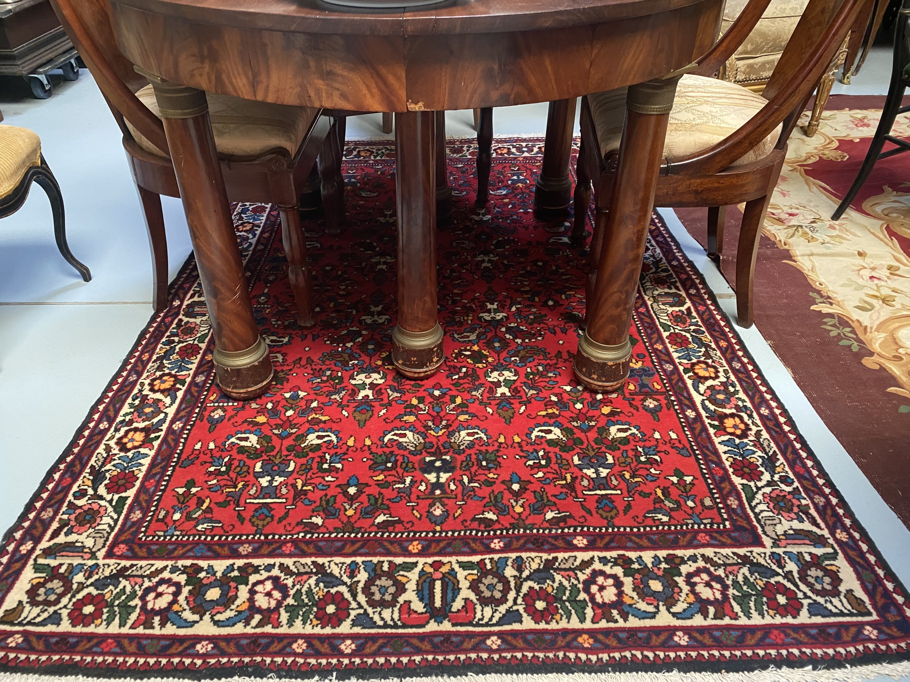 - Perse (Baktyar?). Tapis à fond rouge, décor de vases de fleurs, bordure crème d’une frise de fleurs entre des galons. Long. 194 Larg. 128 cm.