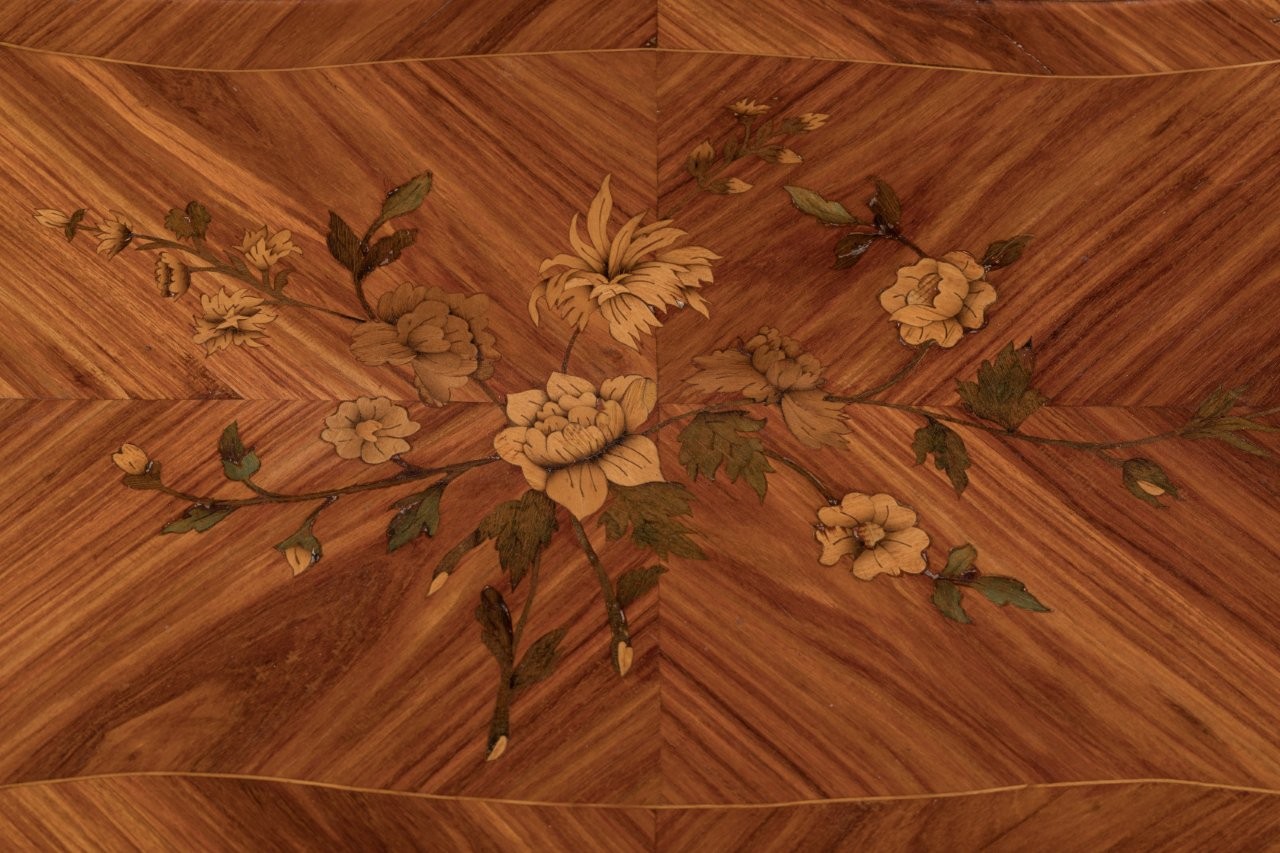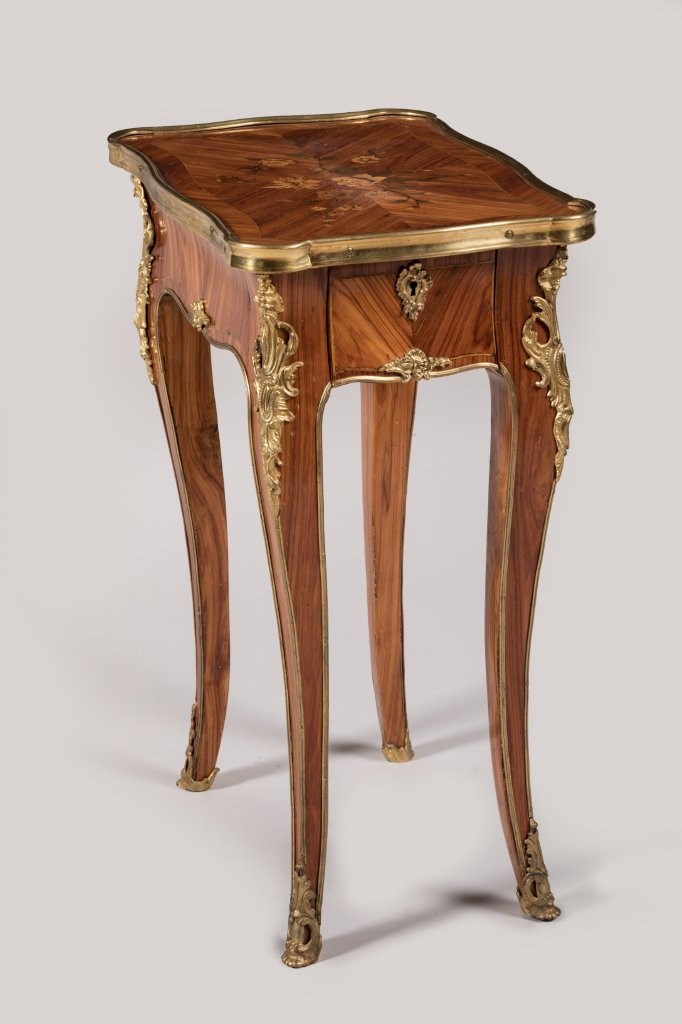 Le plateau, ceint d'une lingotière, est marqueté d'un décor de branches fleuries en buis et de bois vert sur un frisage de bois de rose. Elle ouvre par un tiroir latéral et repose sur quatre pieds légèrement galbés. Les chutes d'angles en forme de coquilles sur feuilles d'acanthe, l'entrée de serrure, les arêtes et les sabots en bronze doré sont marqués d'un "C couronné".