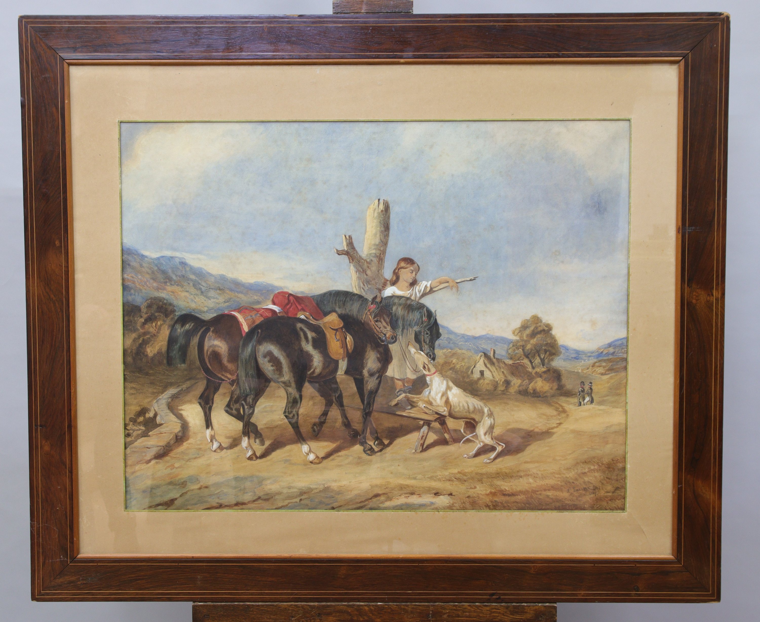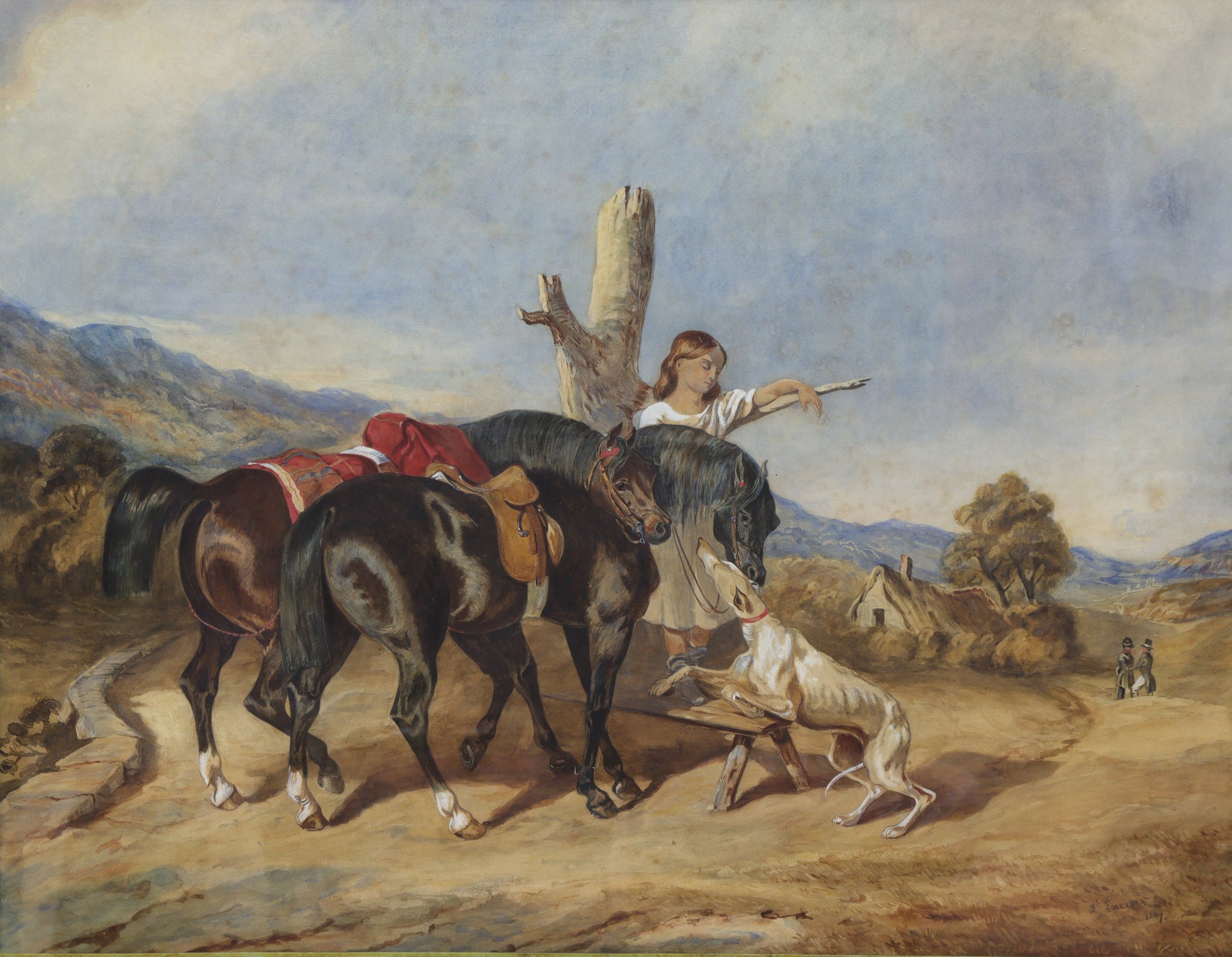 Aquarelle figurant une fillette gardant deux chevaux avec son lévrier.