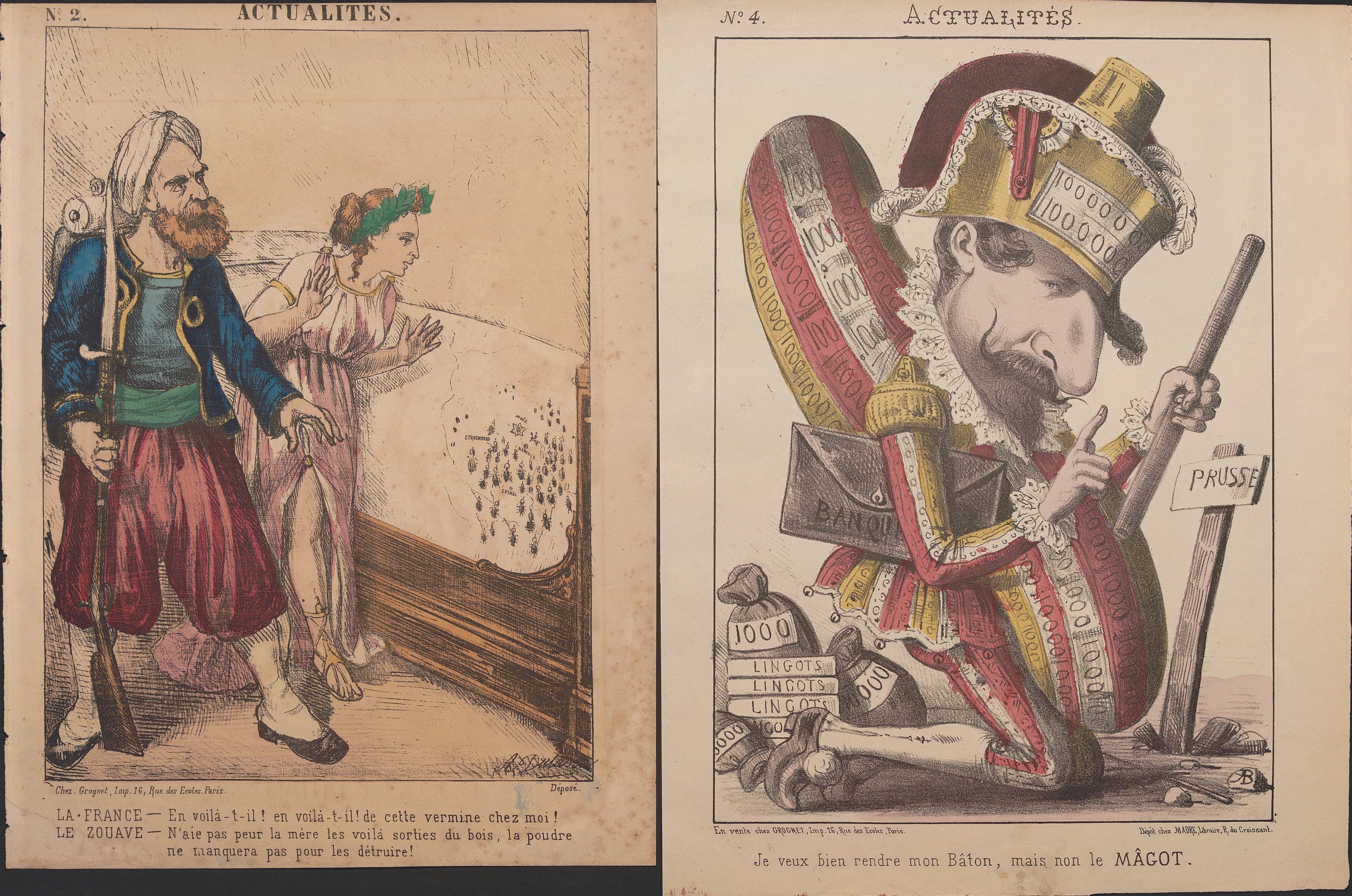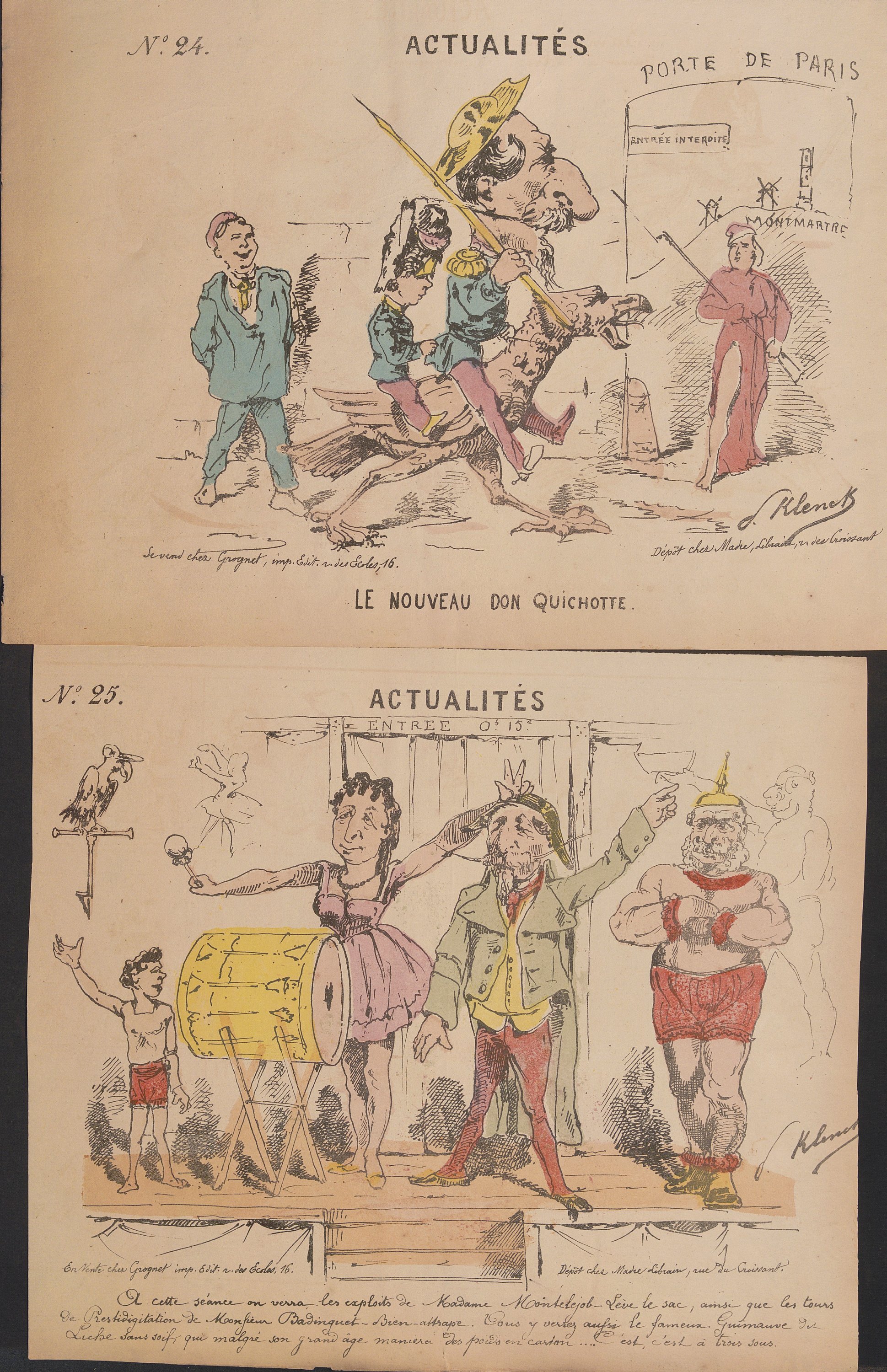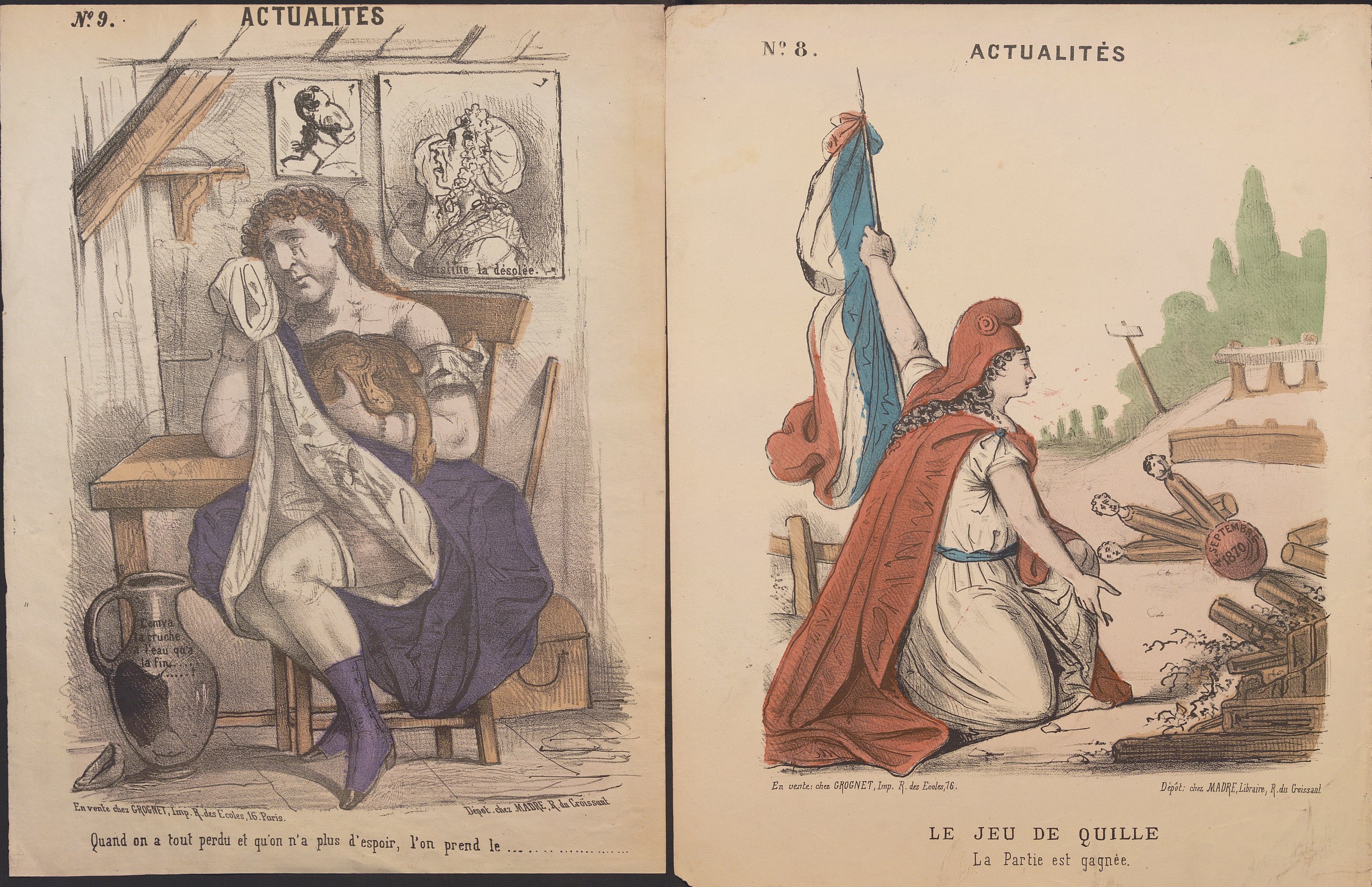 « Actualités », série quasi-complète n°1 au n°87 (mque 79, 80, 82, 83 et 87), formats divers ; feuilles volantes illustrées par différents dessinateurs/illustrateurs publiées et vendues dès le début de la guerre de 1870 jusqu’à la fin de la Commune de Paris ;