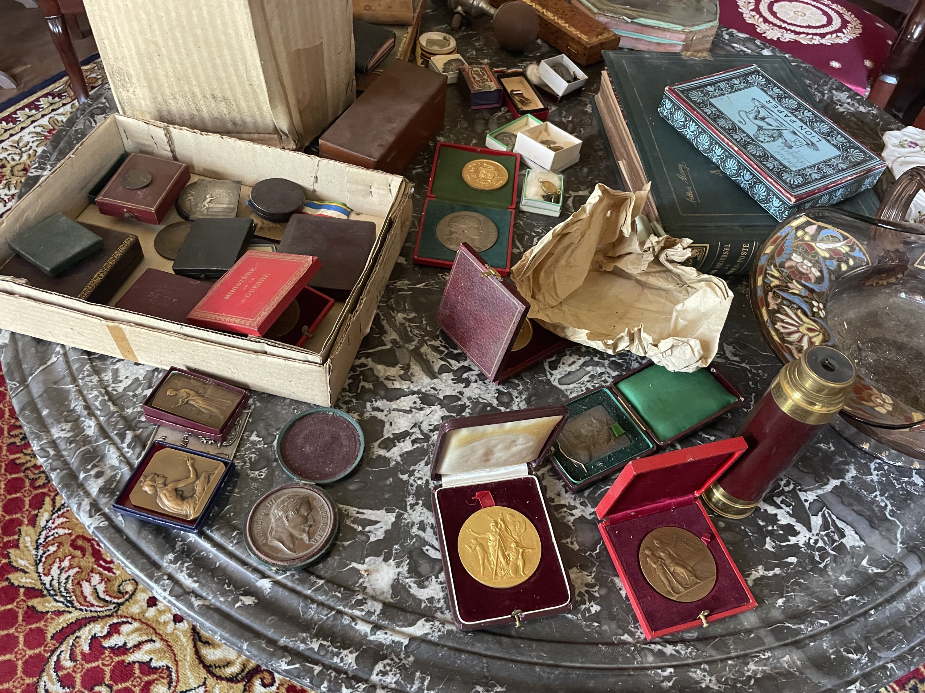 Mobilier de style Haute Epoque, Louis XIII, Louis XV, Louis XVI et collections de bibelots dont pendules, éventails, sceaux de cire, collections de céramiques, médailles, souvenirs militaires, peintures et deux piano droits