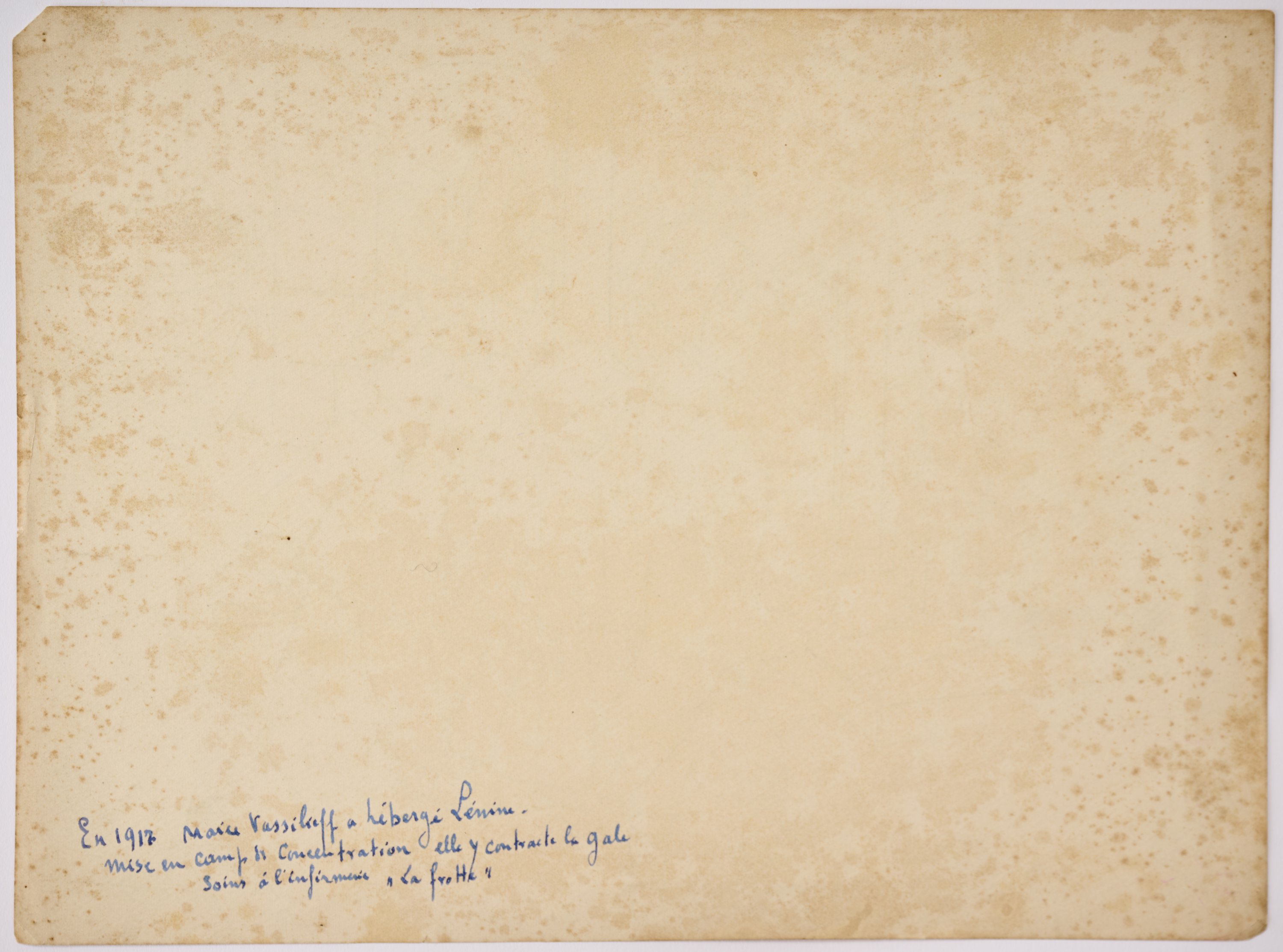Au revers "En 1913, Marie Vassilieff a hébergé Lénine. Mise en camp de concentration - au sens de regroupement pas d’extermination - elle y contracte la gale. Soins à l'infirmerie "La frotte"".