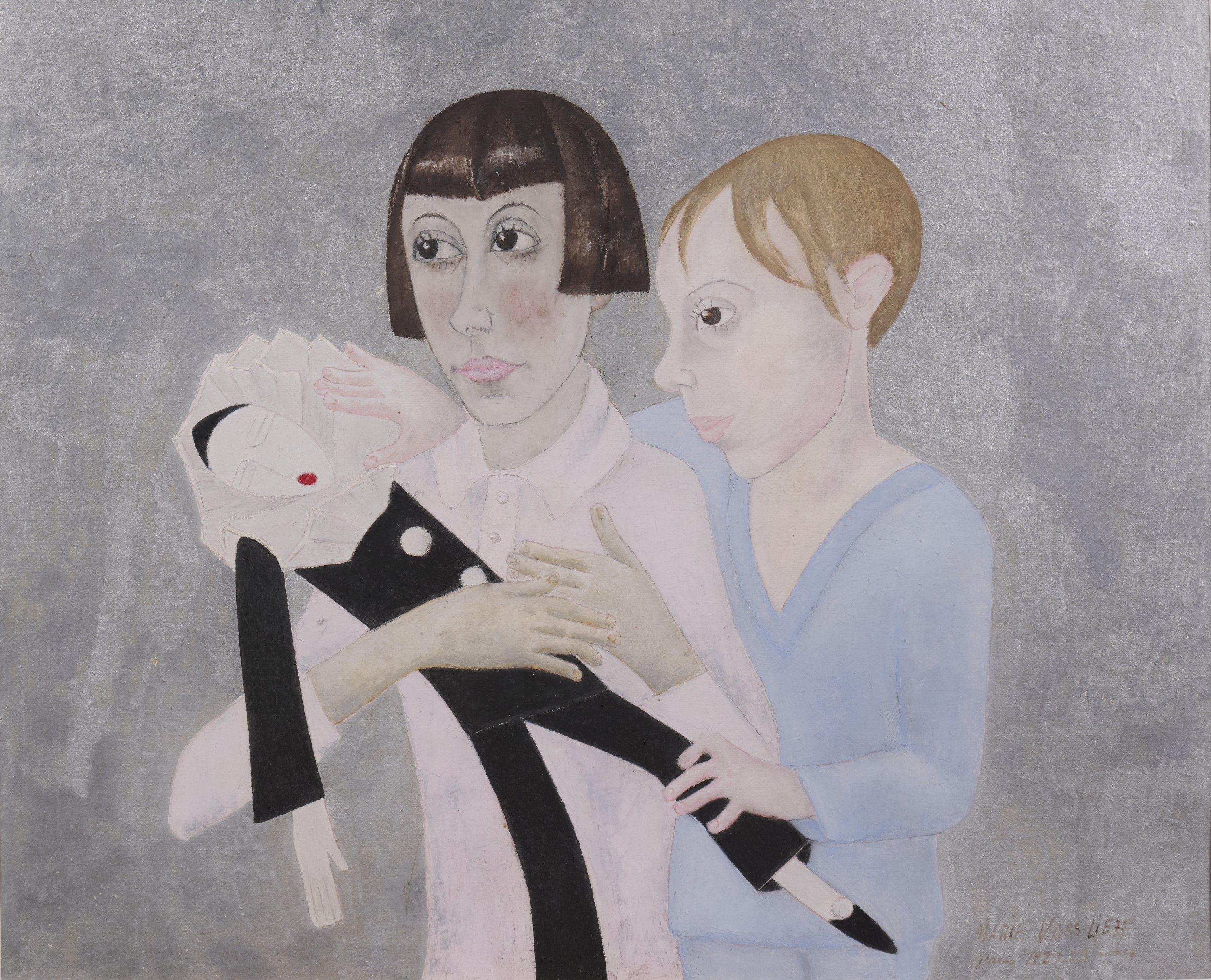 Au tournant des années trente, Marie Vassilieff exécute une série d’éblouissants portraits à fond d’argent plus ou moins modulé. Charlotte et Paul Wacker se disputent la complicité de Pierrot le poupon, la poupée de 1922. La poupée est un personnage récurrent dans cet univers, où Pierrot, Colombine et Arlequin incarnent les masques de la vie parisienne. Le fond d’argent laqué, les incisions minimes, le recours à l’équilibre sous-jacent des couleurs primaires font penser aux papiers découpés de Matisse. L’assemblage des papiers collés, la tradition byzantine des icônes et les éclats de mosaïques de Ravenne s’inscrivent dans une même langue visuelle secrète et personnelle. Exposé à Paris en 1998 et reproduit dans Paris Montparnasse en 1929, ce tableau appartient à une série qui constitue l’un des sommets méconnus de son œuvre des années folles.