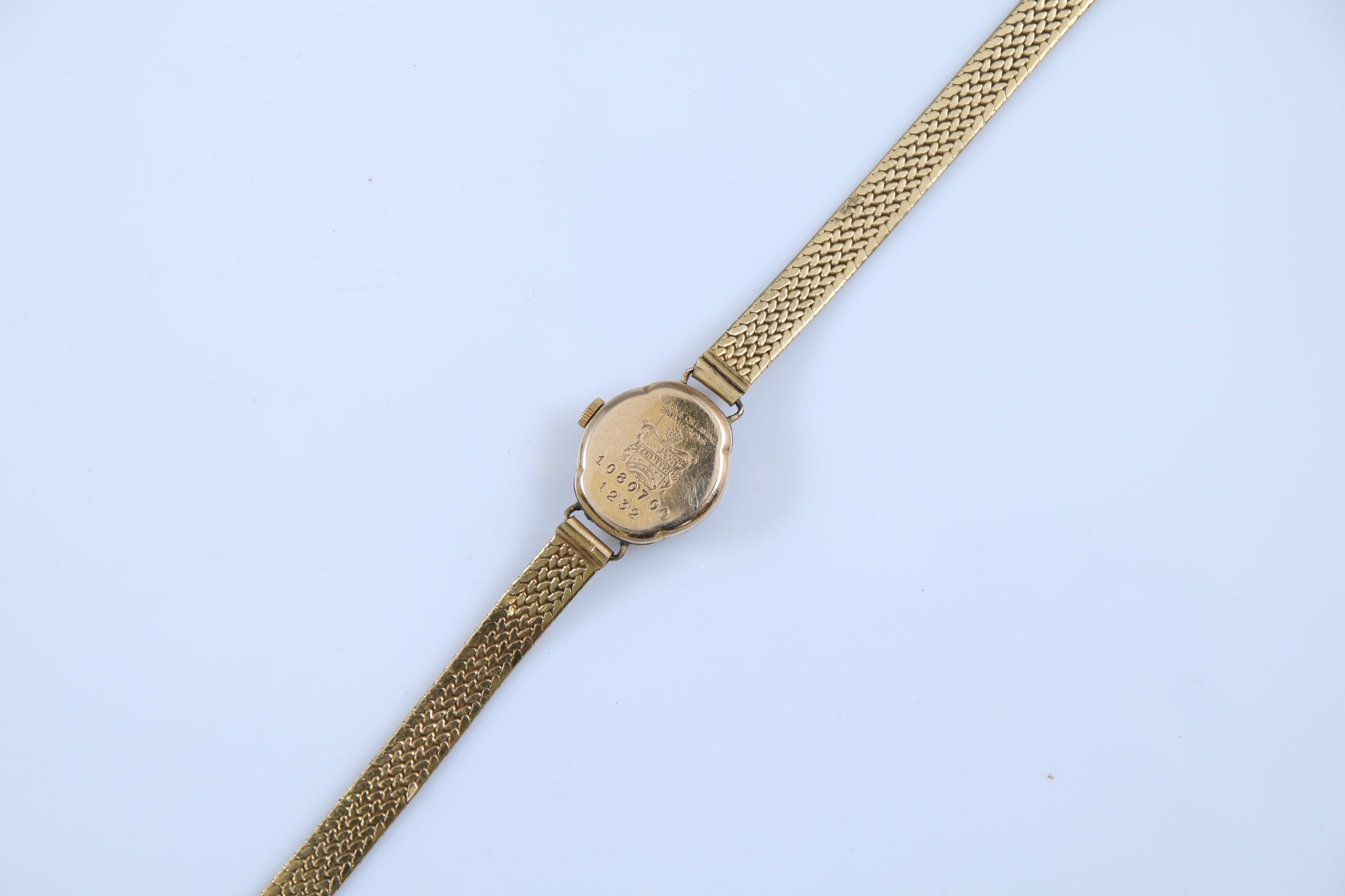 Le boitier circulaire au cadran champagne indiquant les heures en chiffres arabes et bâtonnets. Il est numéroté au revers "1080700 / 1232". Mouvement mécanique. Le bracelet en or jaune 750 millièmes.