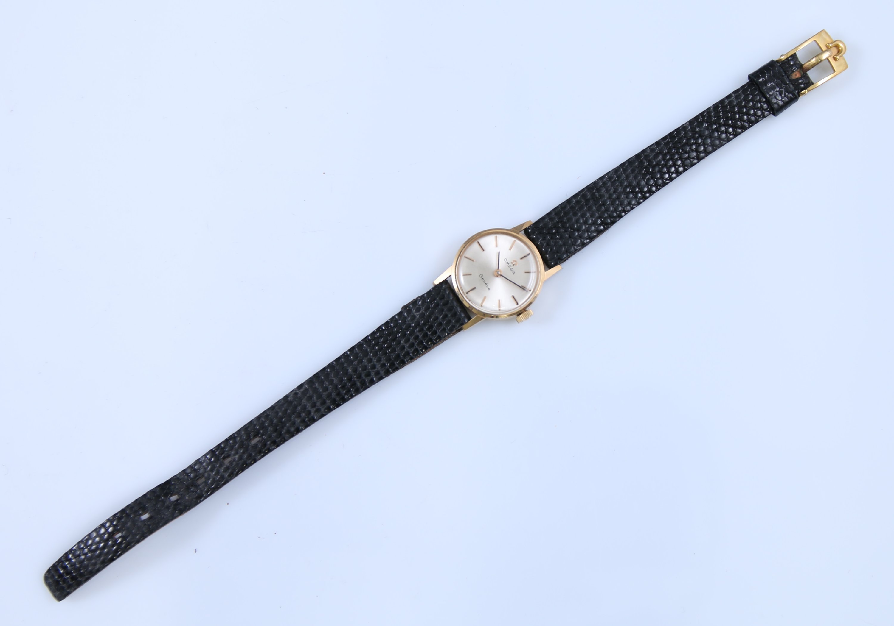 Le cadran argenté indique les heures par des bâtonnets. Il est signé "Omega Genève".