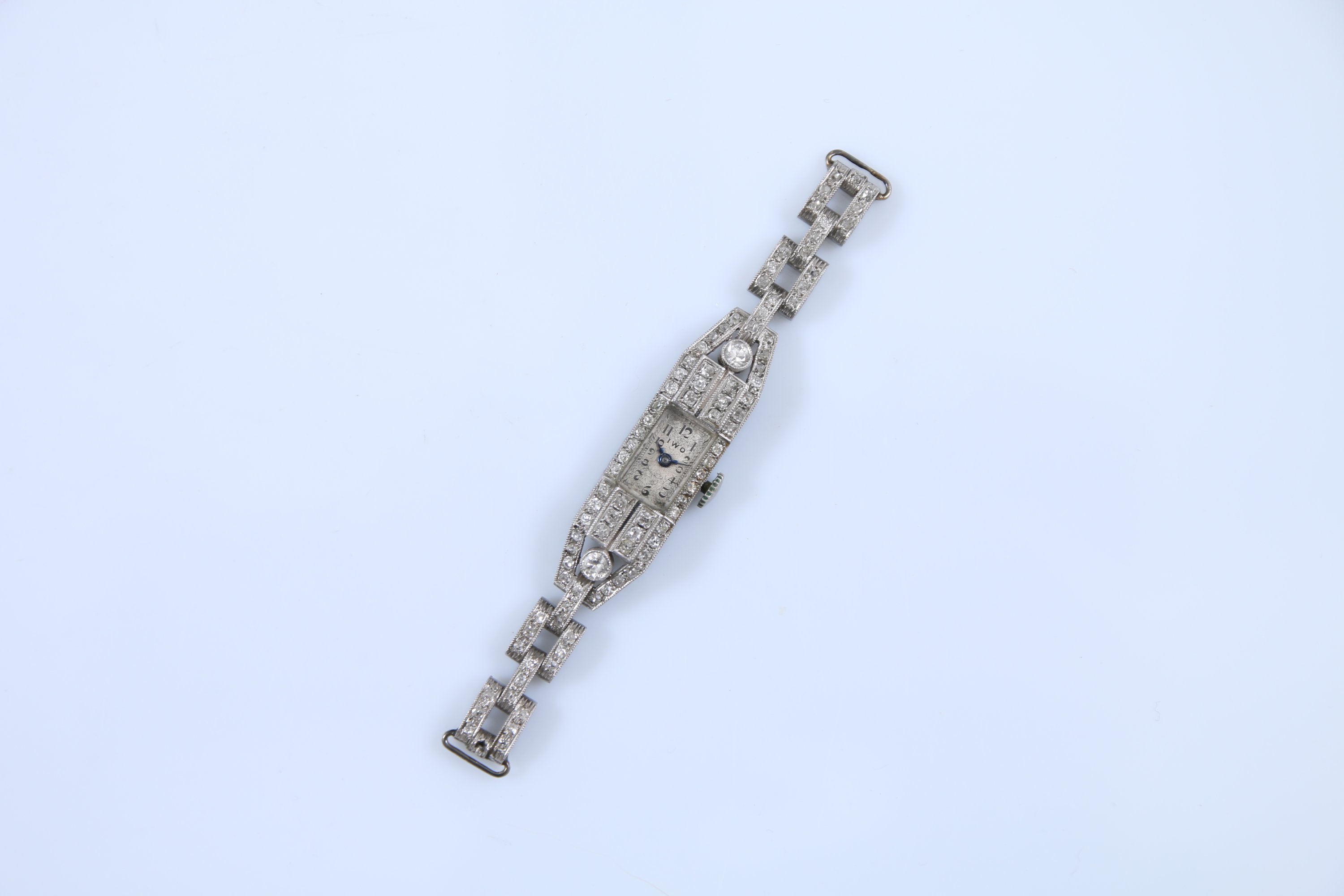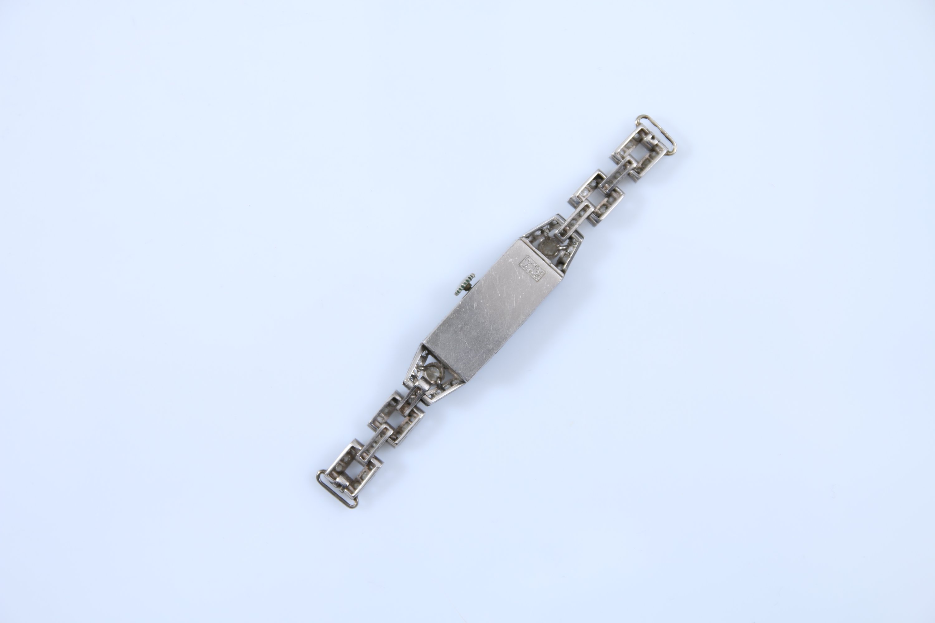 Le boitier rectangulaire au cadran avec les heures en chiffres arabes et signé "IWO". Bracelet et fermoir anciennement à ruban. Mouvement mécanique.