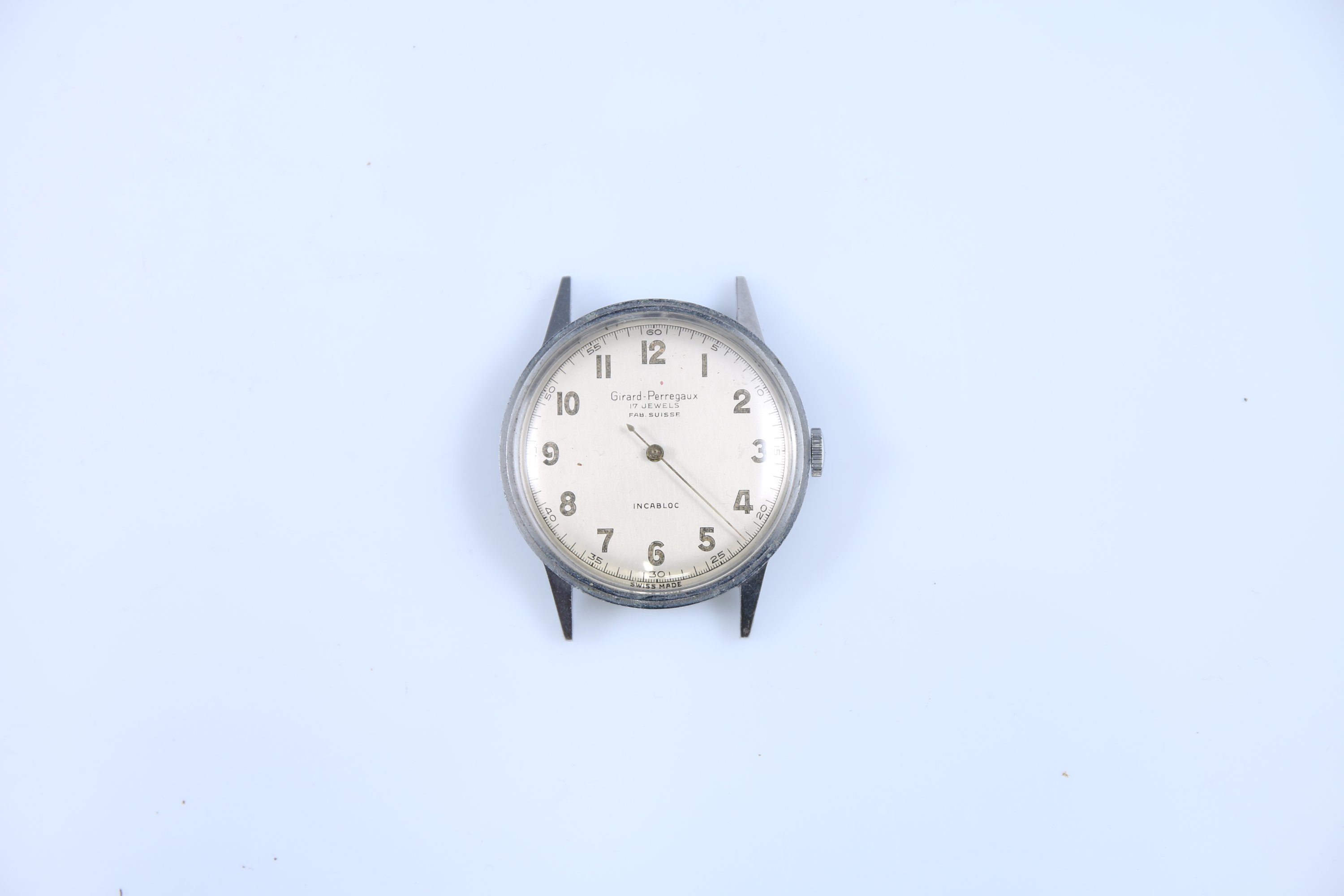 Joint: Girard Perregaux. Boitier de montre d'homme en acier au cadran indiquant les heures par des chiffres arabes. Mouvement mécanique. (manque une aiguille).