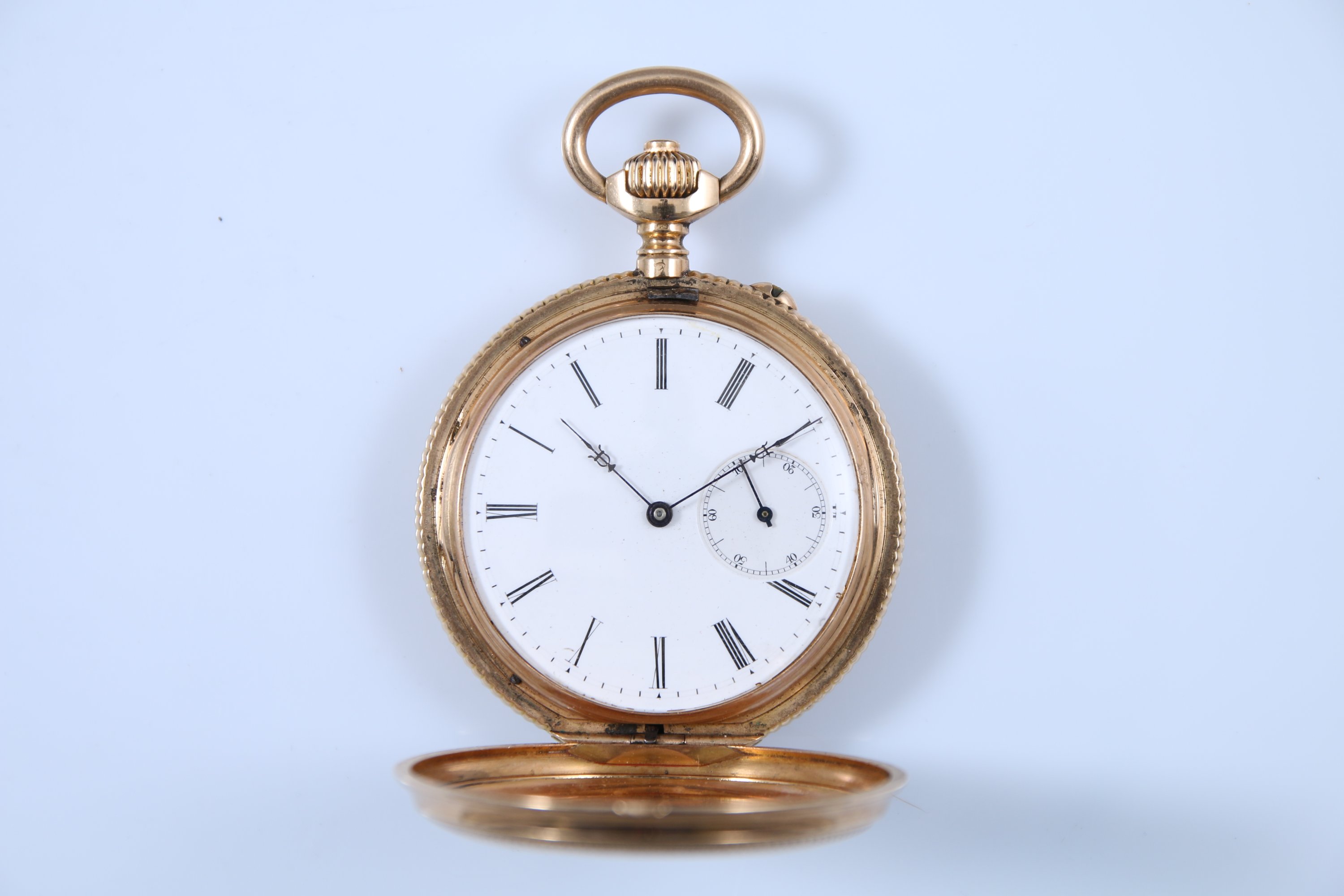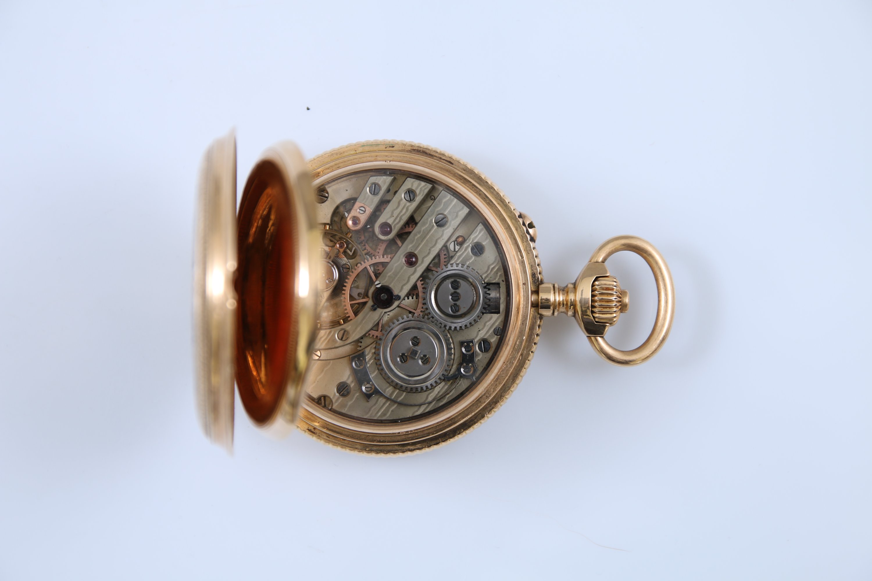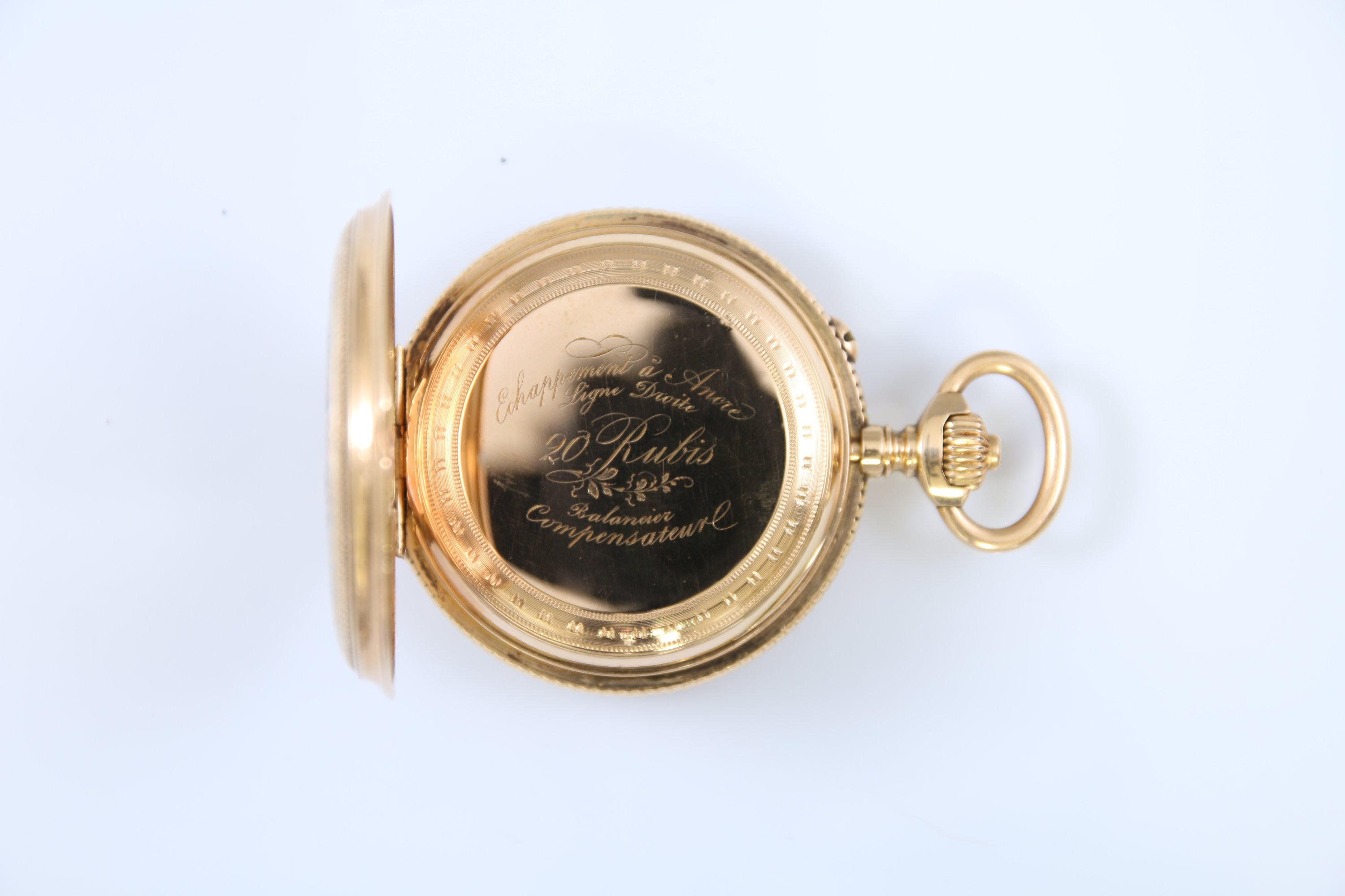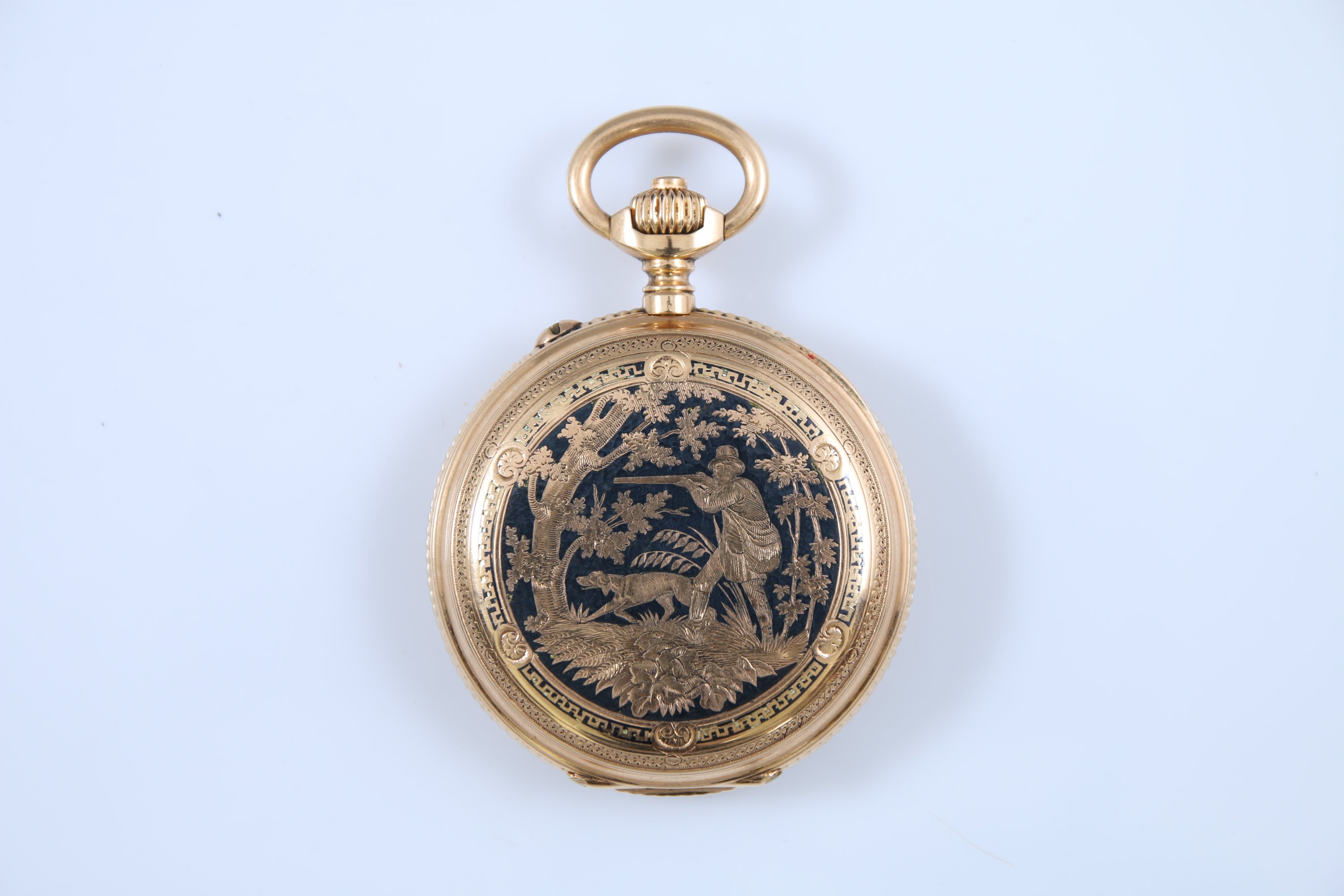 Le boitier décoré à l'avers d'un bonnet dans un entourage de trophée d'armes et frise de grecques, et le revers d'un chasseur et son chien. Le cadran émaillé blanc indiquant les heures en chiffres romains, les minutes par un chemin de fer. Petite trotteuse à 6 heures. Le cache poussière gravé "échappement à ancre / ligne droite / 20 rubis balancier / compensateur".