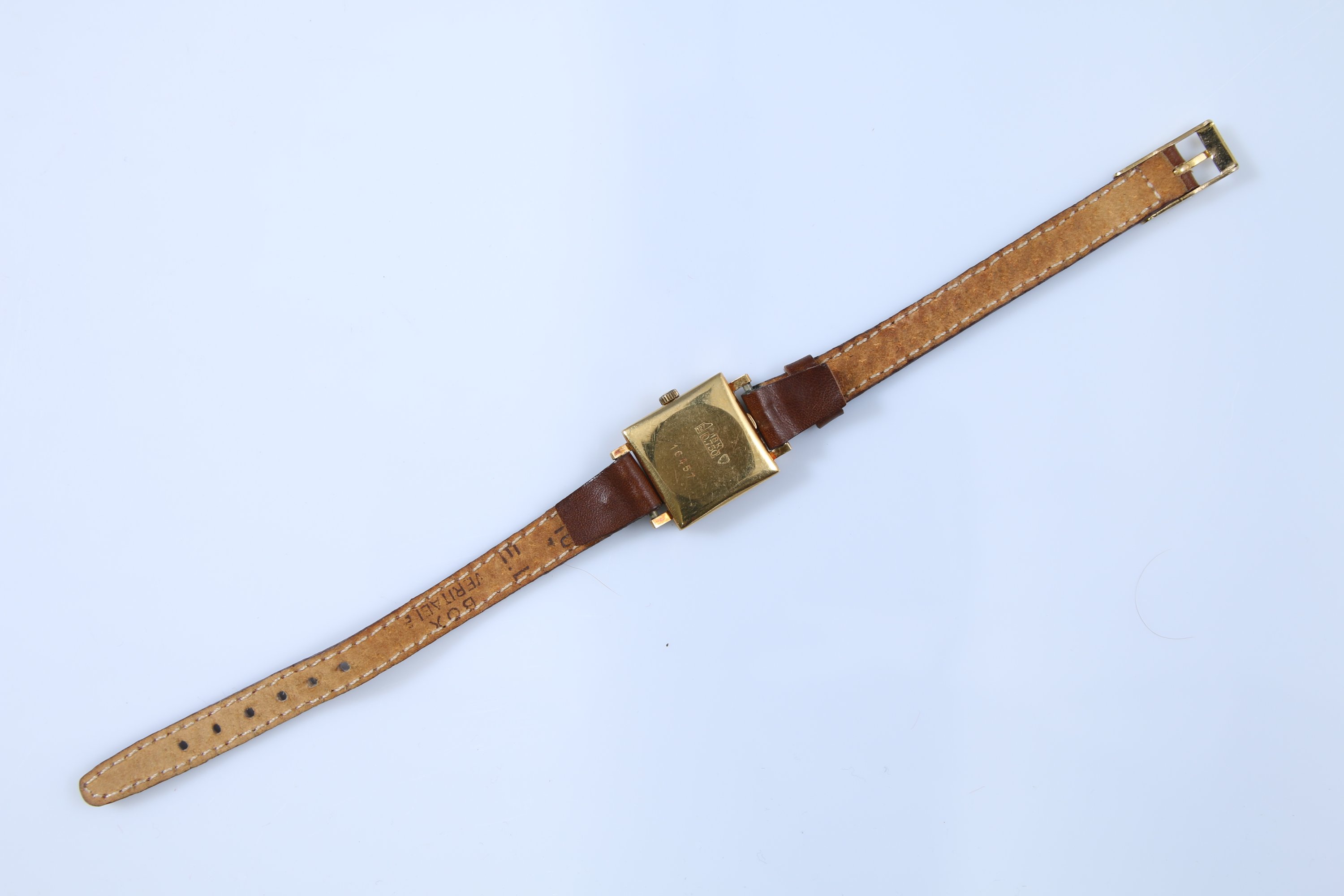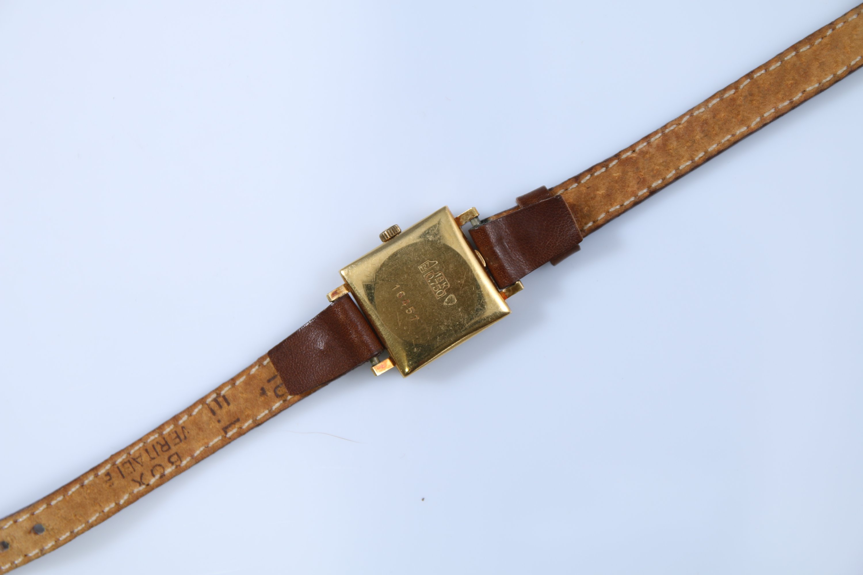 Or jaune 750 millièmes de forme carrée, remontoire à trois heures, le cadran signé Maurice Guerdat. Boitier numéroté 16457.
