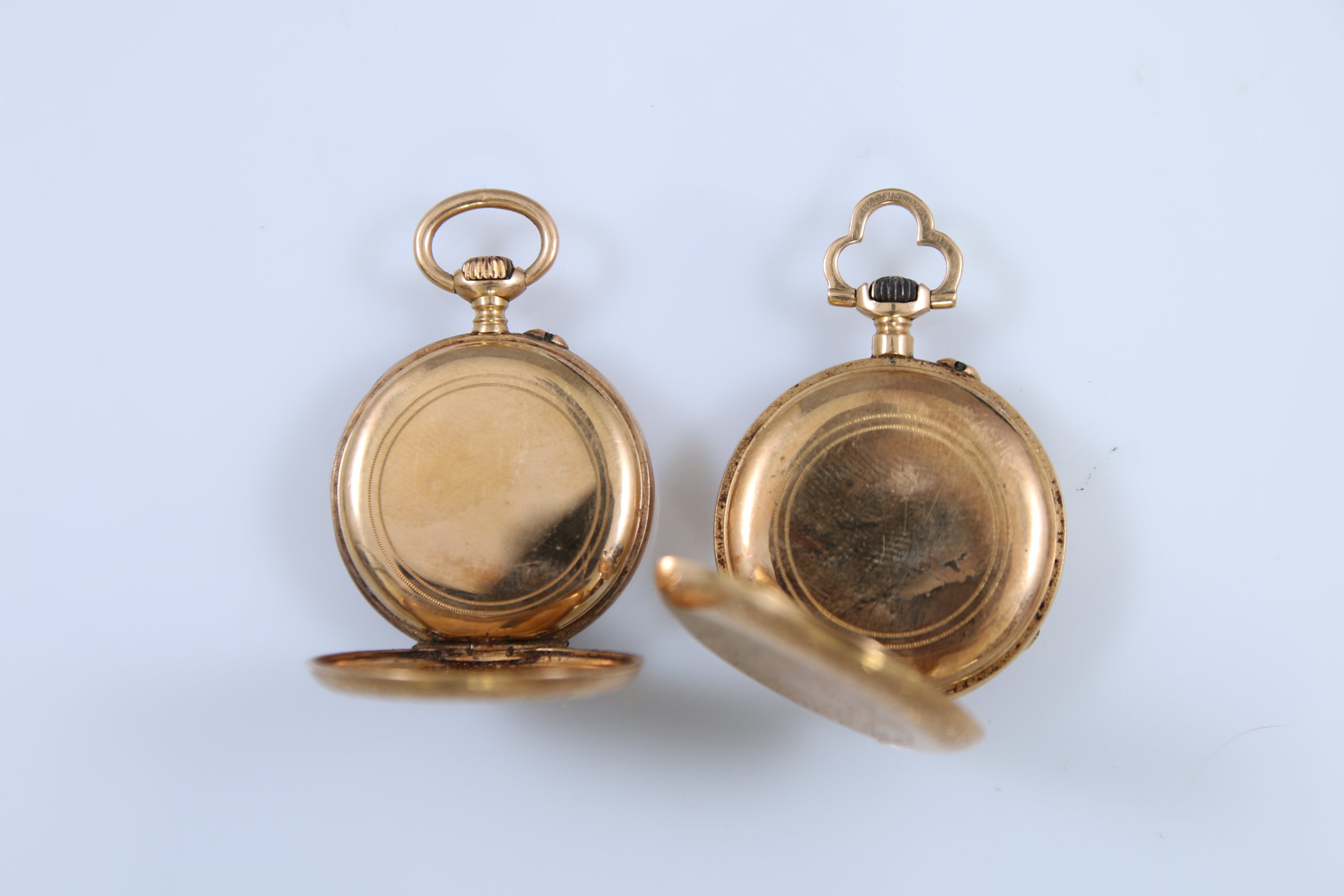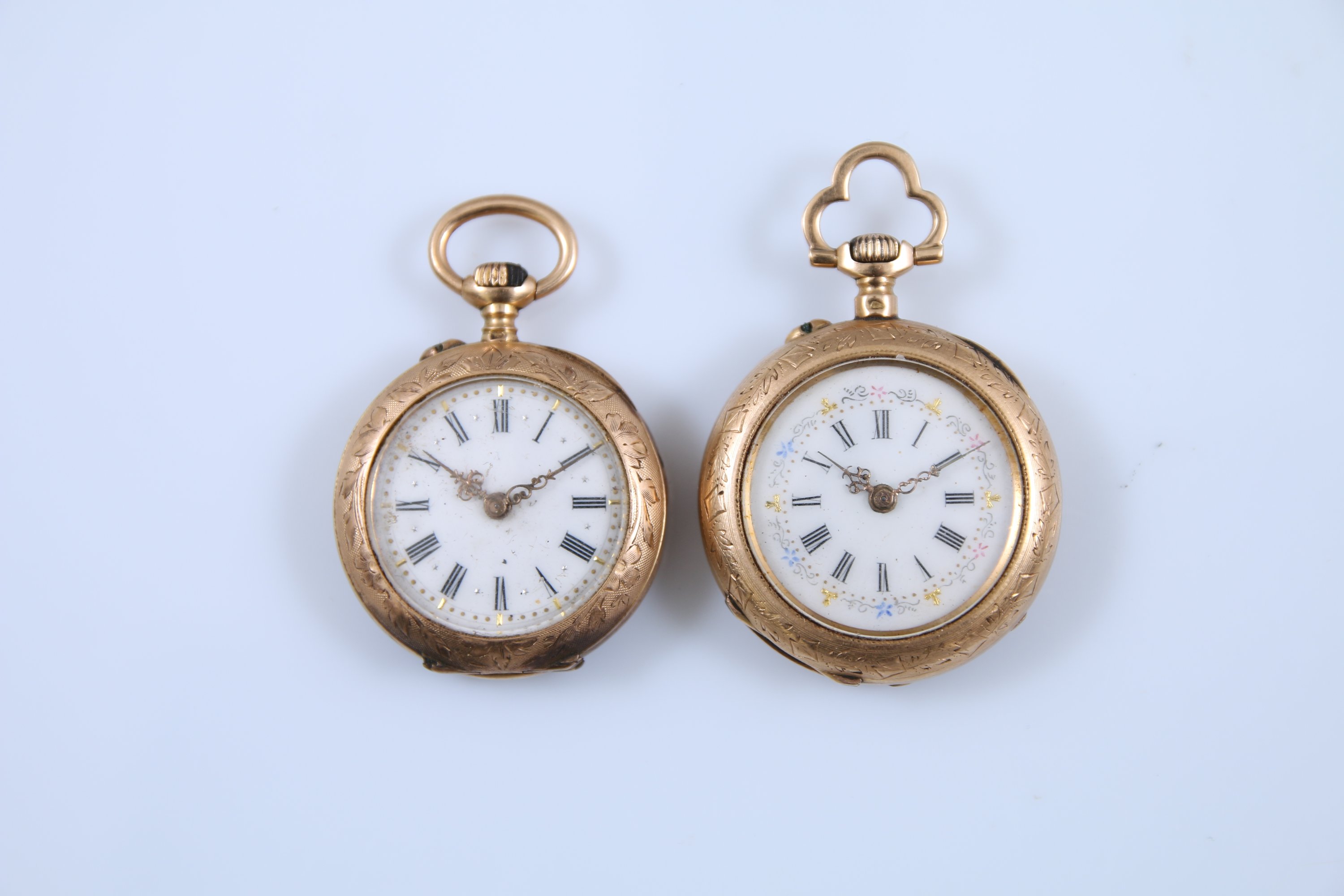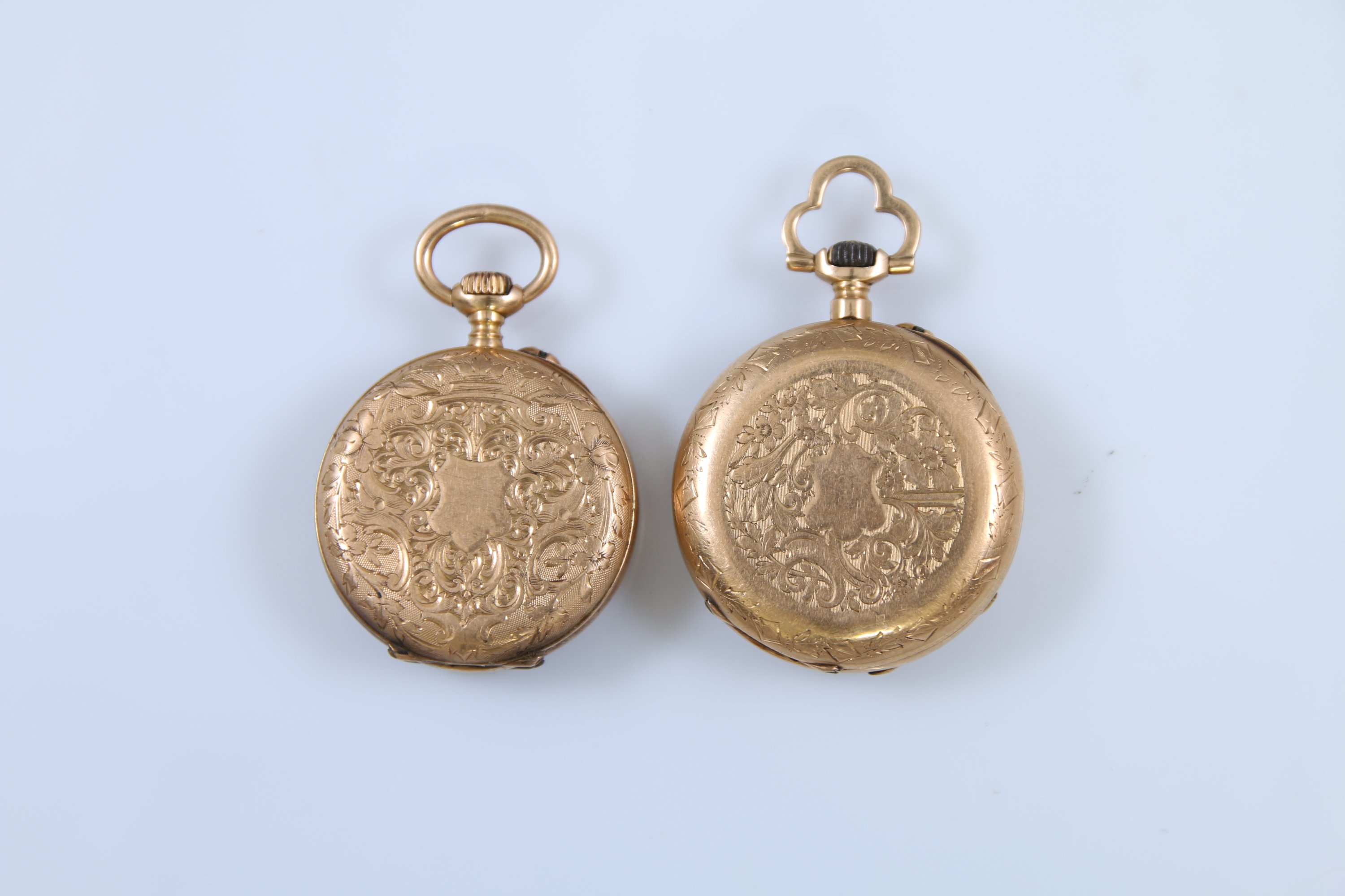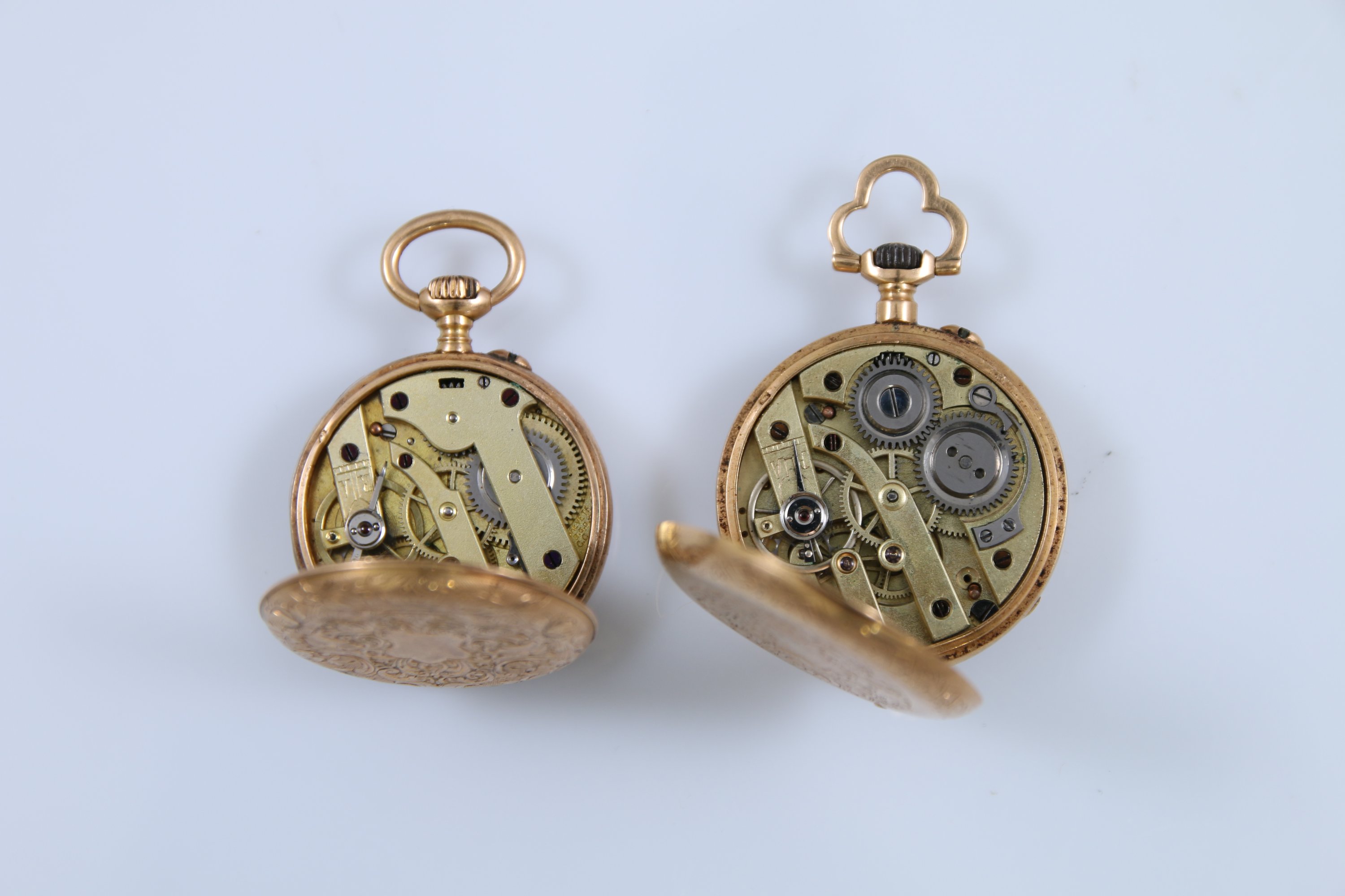 A cadrans émaillés blanc indiquant les heures en chiffres romains. L'une à la bélière trilobée. Les boitiers gravés de riches décor d'enroulements.