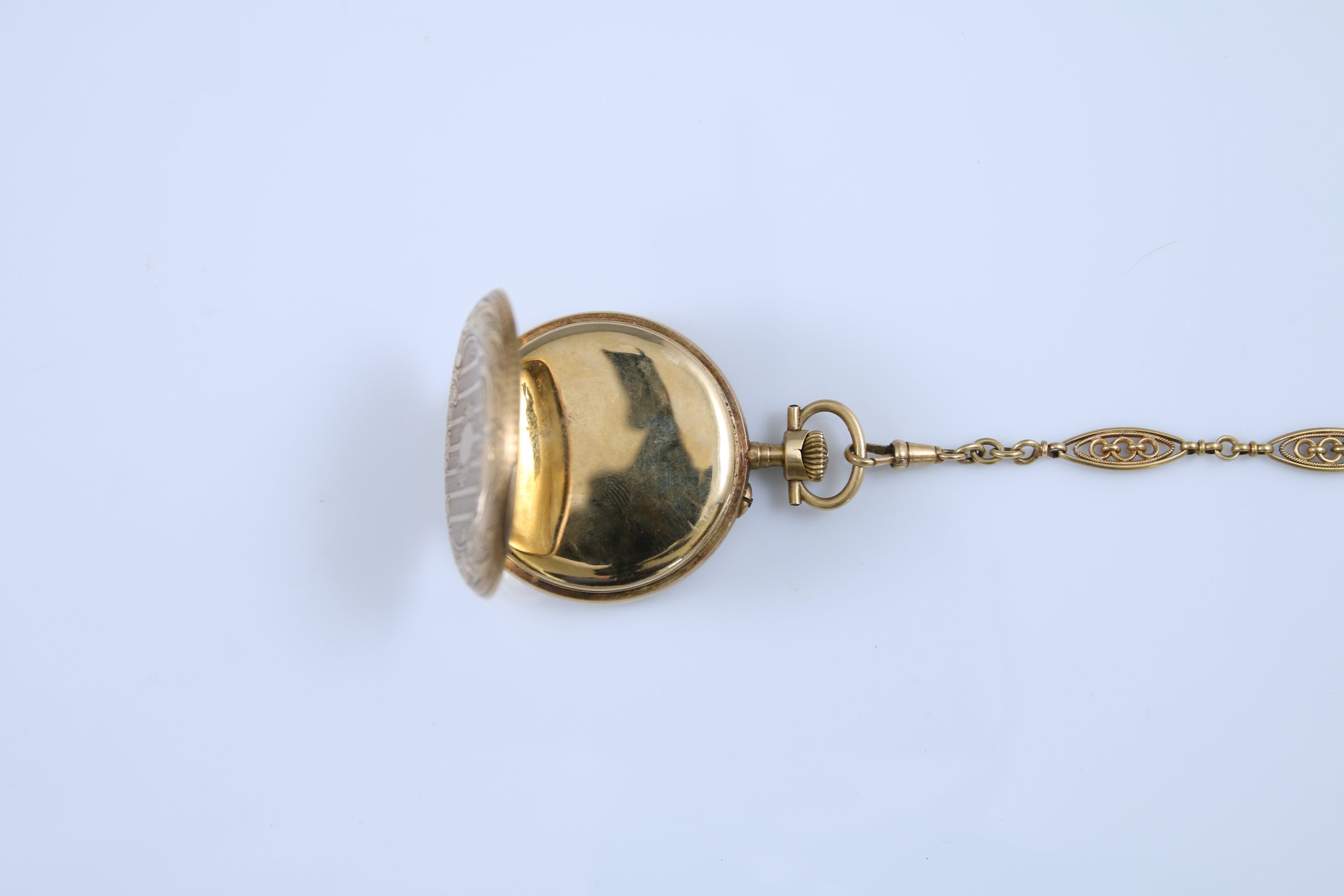 La montre au cadran émaillé blanc indiquant les heures en chiffres romains, les minutes par des pointillets et chiffres arabes. Remontoir à 12 heures. Bélière. Le revers du boitier à décor d'un médaillon dans un entourage de rinceaux. Cache-poussière intérieur en or.