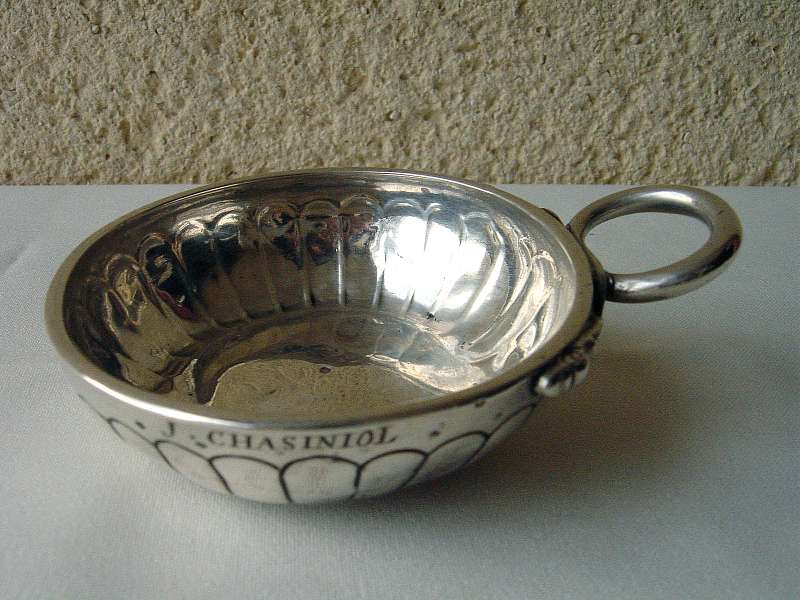 TASSE à VIN en argent décoré de cannelures, l'anse serpent enroulé posant sur une petite bâte unie. Le corps gravé Jean DUMAS J. CHASINIOL. (Bosses). Maître-orfèvre: Benoît JULIEN.