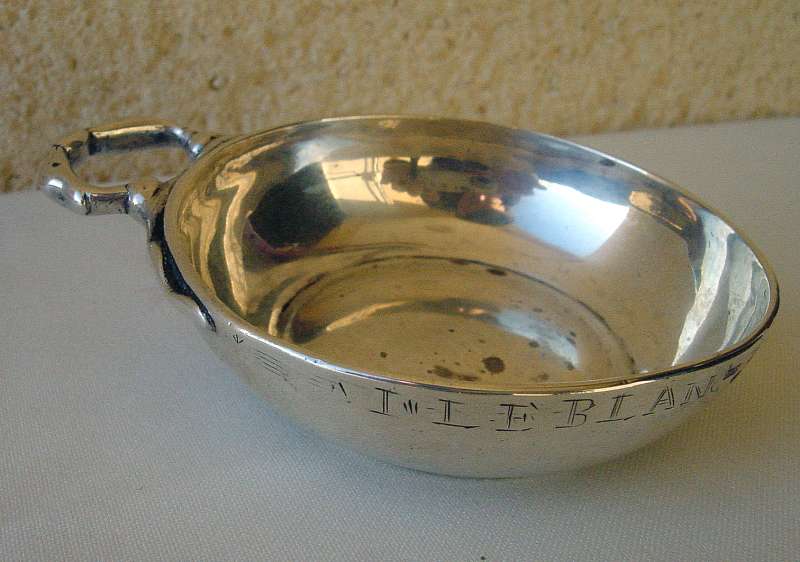 TASSE à VIN en argent, l'anse serpents affrontés. Elle pose sur une petite bâte unie, le corps chiffré I. LEBLANC BR. Poinçons illisibles. XVIIIème siècle. Poids: 88 g.