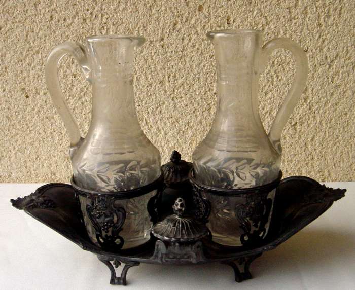 HUILIER-VINAIGRIER, en argent, plateau navette recourbée ornée de coquilles, rinceaux, pampres. Écusson armorié. Paris 1776. Maître-orfèvre illisible. Poids: 612 g. Long. 29 cm. Haut. 8,5 cm. Larg. 16 cm.