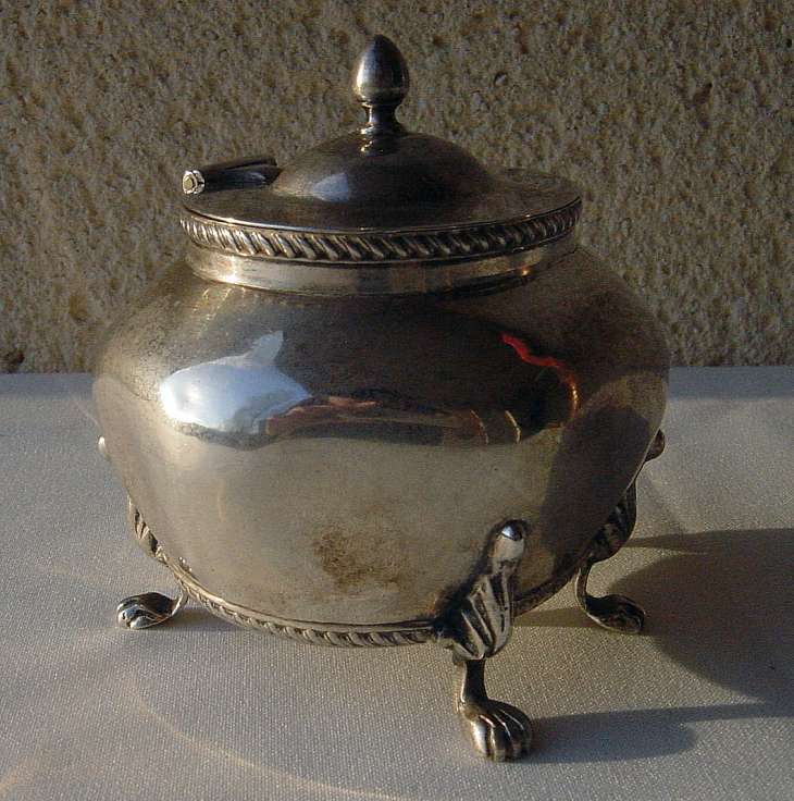 SUCRIER en argent. De forme hexagonal, il est porté par quatre pieds en griffes et attaches en feuilles d'acanthe. La panse, renflée dans sa partie supérieure, est ornée de frises enrubannées. Le couvercle, monté à charnière, présente un bouton en forme de pomme de pin stylisée. Poinçons "à l"ancre" et "lion passant", Birmingham, 1900. Haut. 9 cm. Poids 170 g.