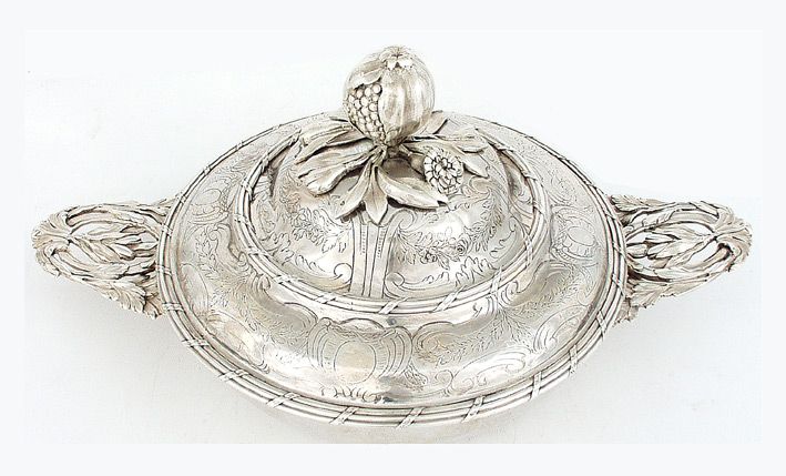 Trés belle ECUELLE avec couvercle en argent, avec deux oreilles, ajourée de feuillage ; le couvercle gravé et rehaussé de filets rubans, la prise de couvercle est ornée de grenade avec feuilles. Paris 1774, Maître-orfèvre Alexande de ROUSSY. Poids: 910 g.