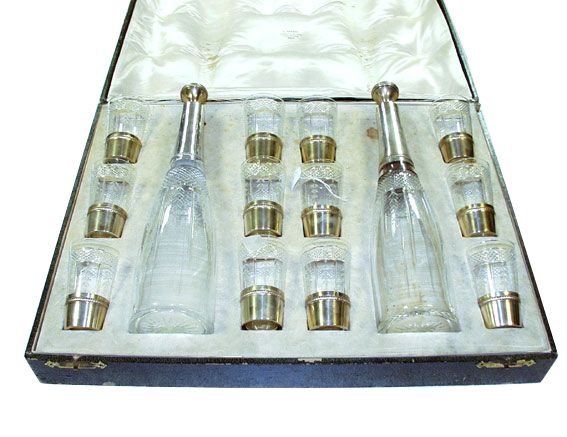 SERVICE à liqueur de 14 pièces: 12 verres et paire de carafes à montures en argent. Poinçon Minerve. Décor à moulures de doubles godrons et cristal taillé. Coffret.