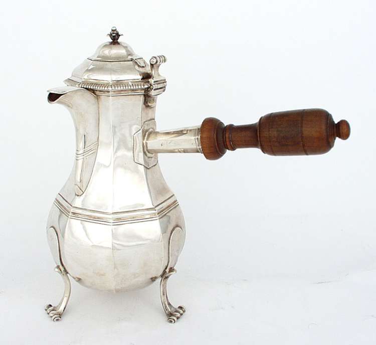 Grande et rare CHOCOLATIÈRE tripode à pans en argent massif, pieds à enroulements à attaches d'écussons, prise de couvercle bouton de fleur bordure godrons, manche latéral bois mouluré. Lille, 1734-1735. Maître-orfèvre: probablement Jean-Baptiste DOUCHET. Poids 1100 g.