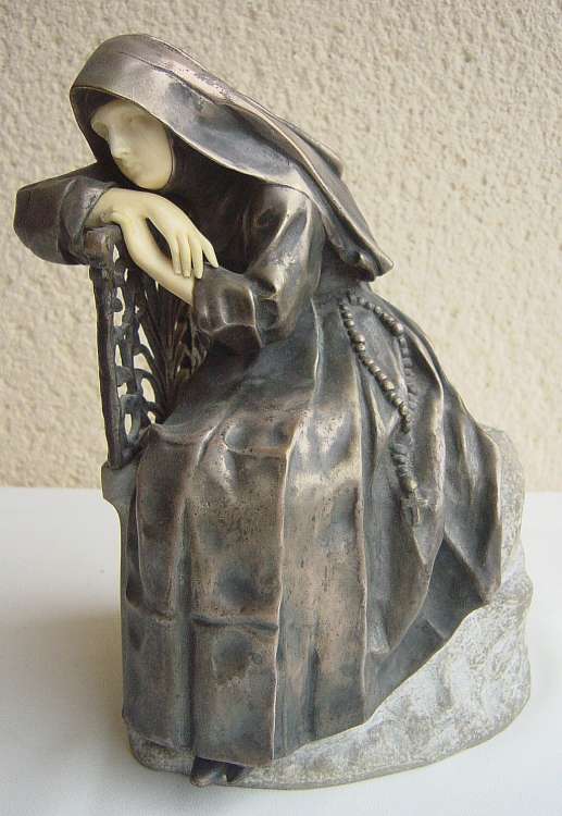 Femme pensive, assise sur un rocher. Chryséléphantine à patine argentée. Terrasse en pierre. Signé au dos. Haut. 24.