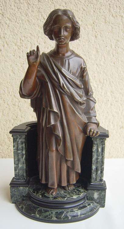 STATUETTE en bronze à patine brune représentant Jésus en toge enseignant. Monté sur une terrasse en marbre noir et veiné vert, en hémicycle. Haut. 30 cm.